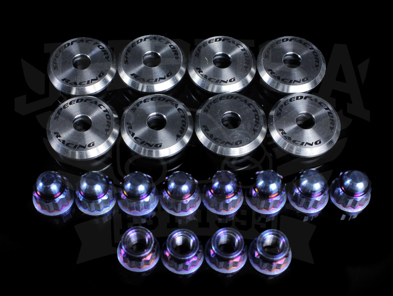 SpeedFactory Racing's Titanium Valve Cover Hardware Set adds a unique finishing touch to any engine bay. These kits are available for Honda / Acura B and H-series VTEC engines in Raw and Burnt finishes. Each titanium washer is precision laser-etched with SpeedFactory's signature logo.