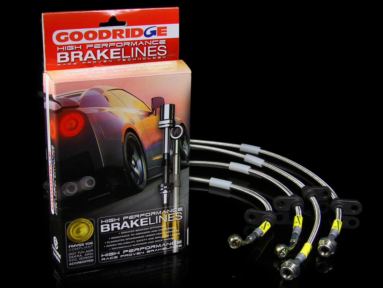 Goodridge G-Stop High Performance Brakeline Kits are direct bolt-on replacements for all of the rubber brake lines in the vehicle's brake system. (Three to six brake lines are included in each kit depending on the vehicle's original design). To ensure proper fit and easy installation, hose ends and brake line brackets that match the vehicle's original equipment style are used for each application.
