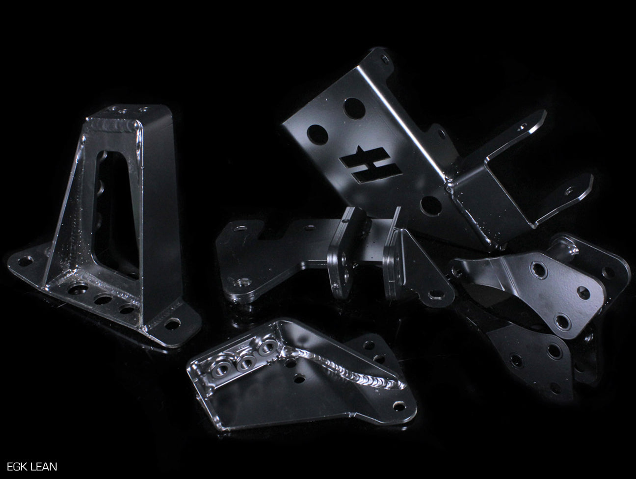 Using Hasport’s patent pending dual height engine mounts keeps the head in the same location. Headers, intakes, and turbo kits will fit the same no matter which engine you choose - K20 or K24. Redesigned brackets make this kit much more street friendly by changing the angle the mounts so the urethane can perform the way it was designed to.