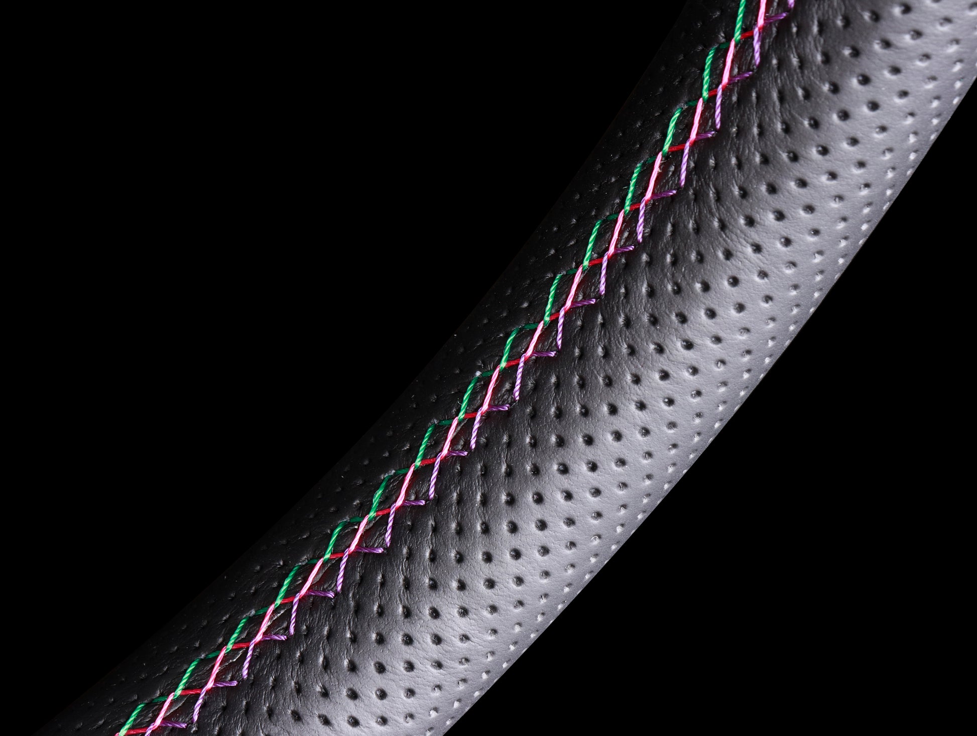 - Luxurious black perforated leather with dimple processing provides exceptional grip.