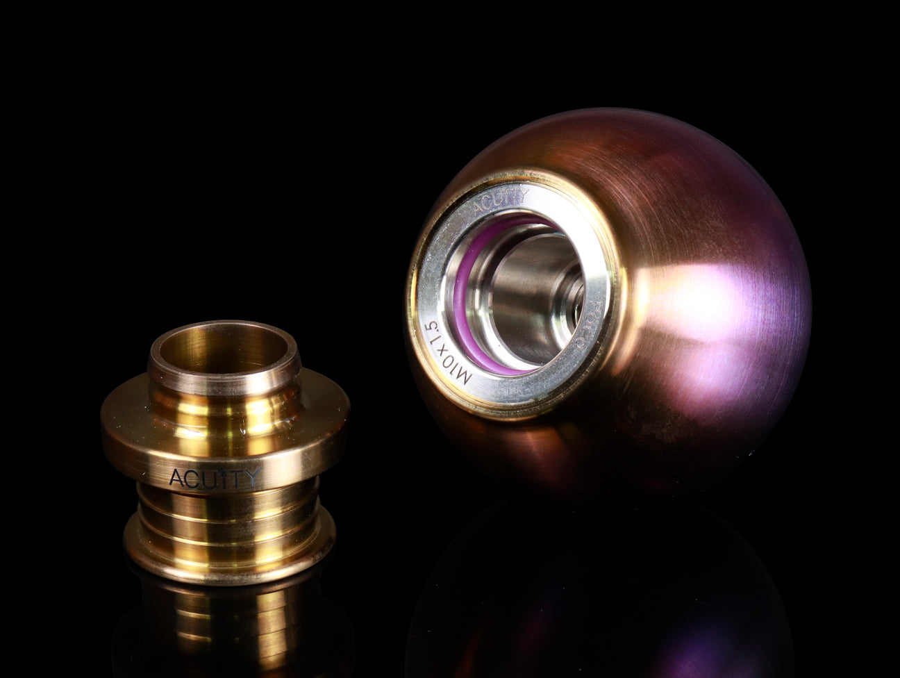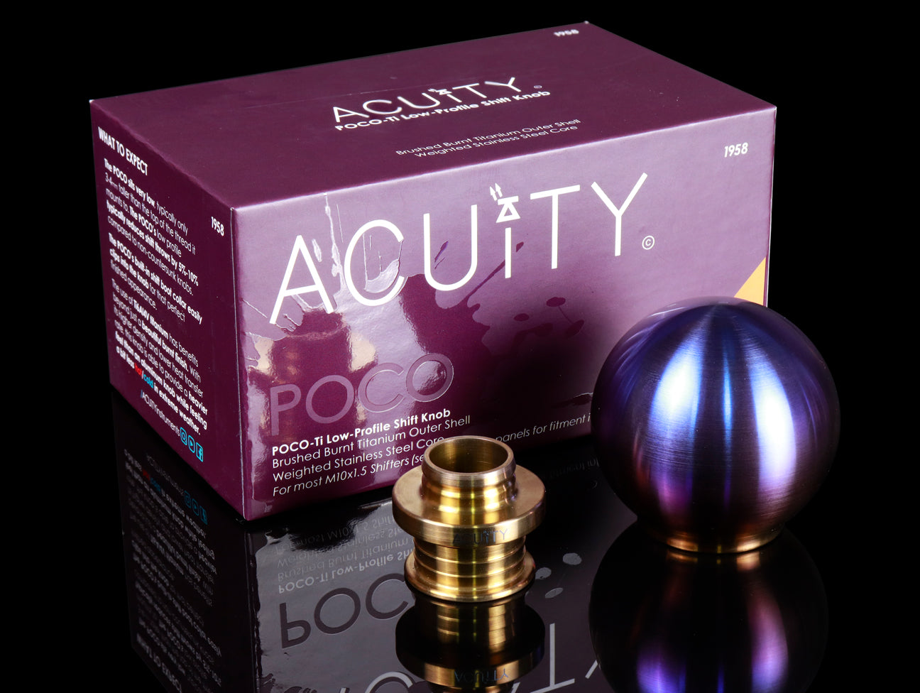 With its low-profile, reduced shift throw, clean shift boot integration, and stunning burnt titanium finish, the POCO-Ti makes for an excellent driving experience. While some might view a titanium shift knob as an aesthetic choice, titanium is 65% denser, has 95% lower thermal conductivity, and has 40% lower heat capacity when compared to aluminum, making it an ideal material for a premium metal shift knob. Countersunk knobs are a popular way to achieve shorter shift throws and reduced knob height without modifying the shifter itself, but most countersunk knobs don't integrate well with the shift boot, leaving the shift boot to sag and the shift lever exposed. ACUiTY's POCO knob resolves this problem with its low height and built-in shift boot collar, the combination of which permits a very low shift knob height combined with a clean-fitting shift boot.