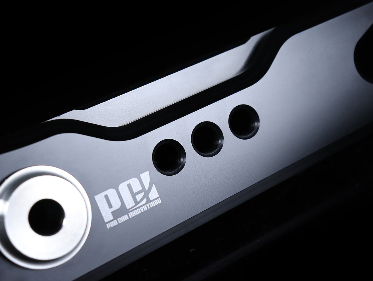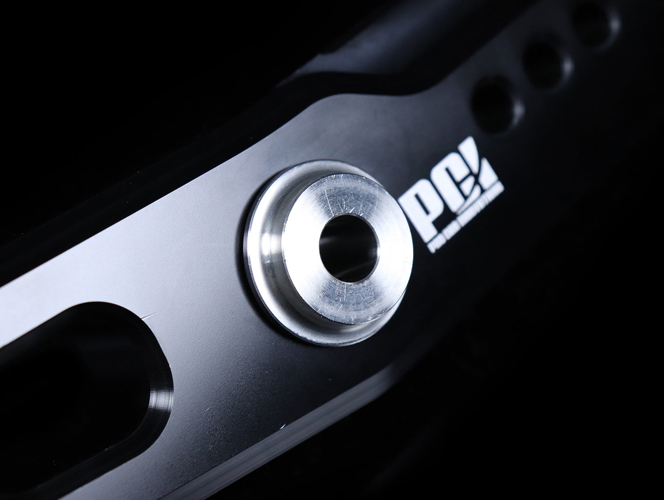 Replacing the factory rubber bushing rear lower control arm with the PCI spherical bearing rear lower control arm effectively helps eliminate issues like sloppy inconsistent handling, alignment changes, rear drift under braking. One of the main key features and most important fix or upgrade to any track car is PCI's shock mounting location design that uses a bronze plain bearing which 100% eliminates all rotational deflection caused from heavier after market sway bars. With PCI's design, the sway bar will react instantly and do its job during cornering. Eliminating the rotational deflection and having the bar react instantly allows the bar load up through out the whole cycle vs. a delay from the arm deflection then a abrupt spike that causes sudden over steer.