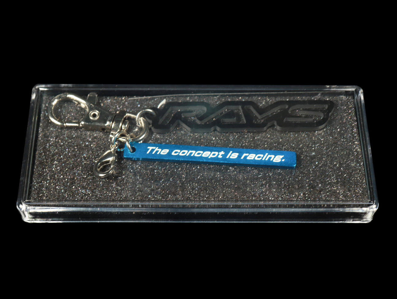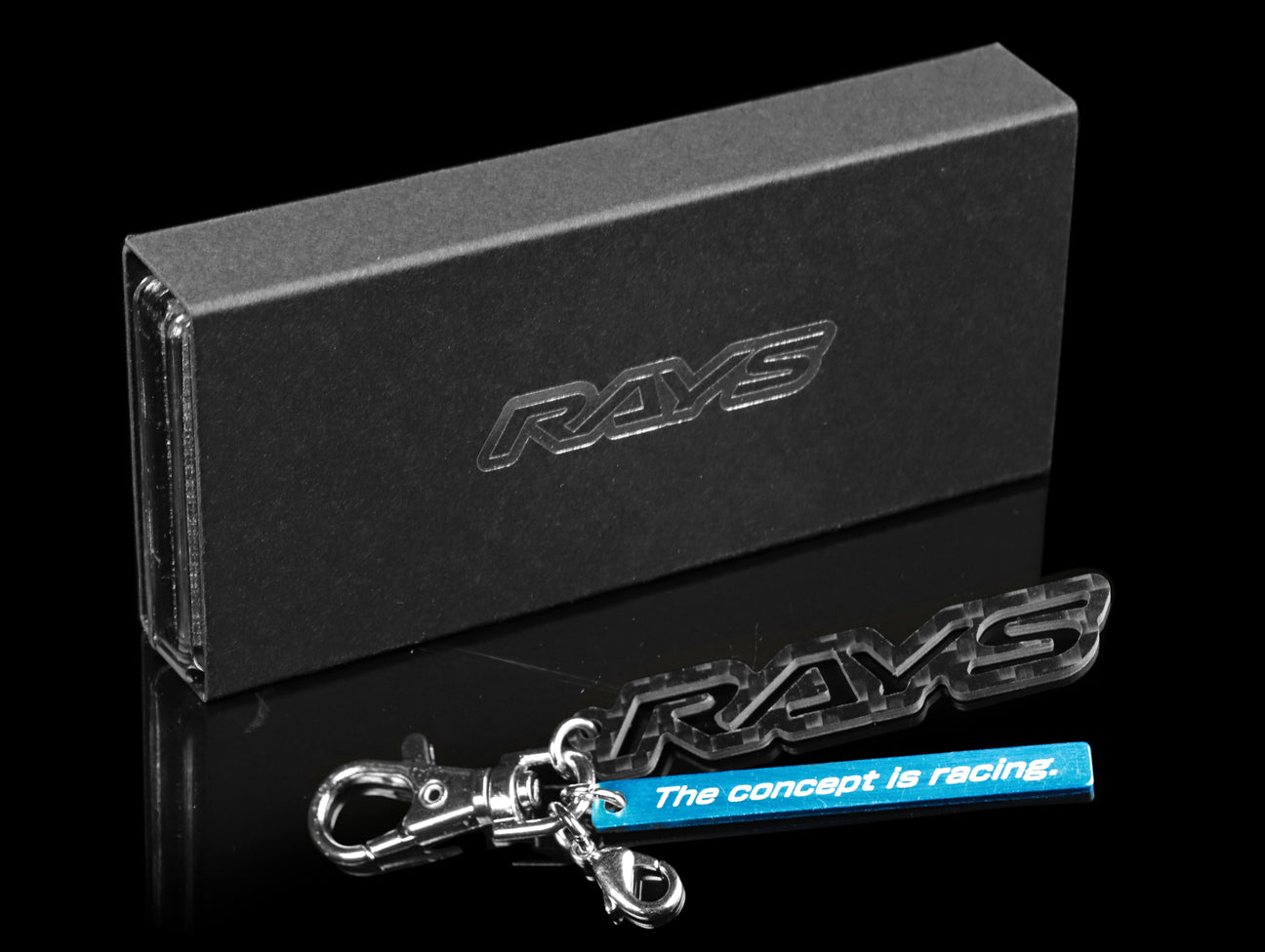 Rays Engineering carbon fiber key holder features a real carbon fiber RAYS 3D logo and The Concept Is Racing anodized blue aluminum tag with large and small snap hooks.