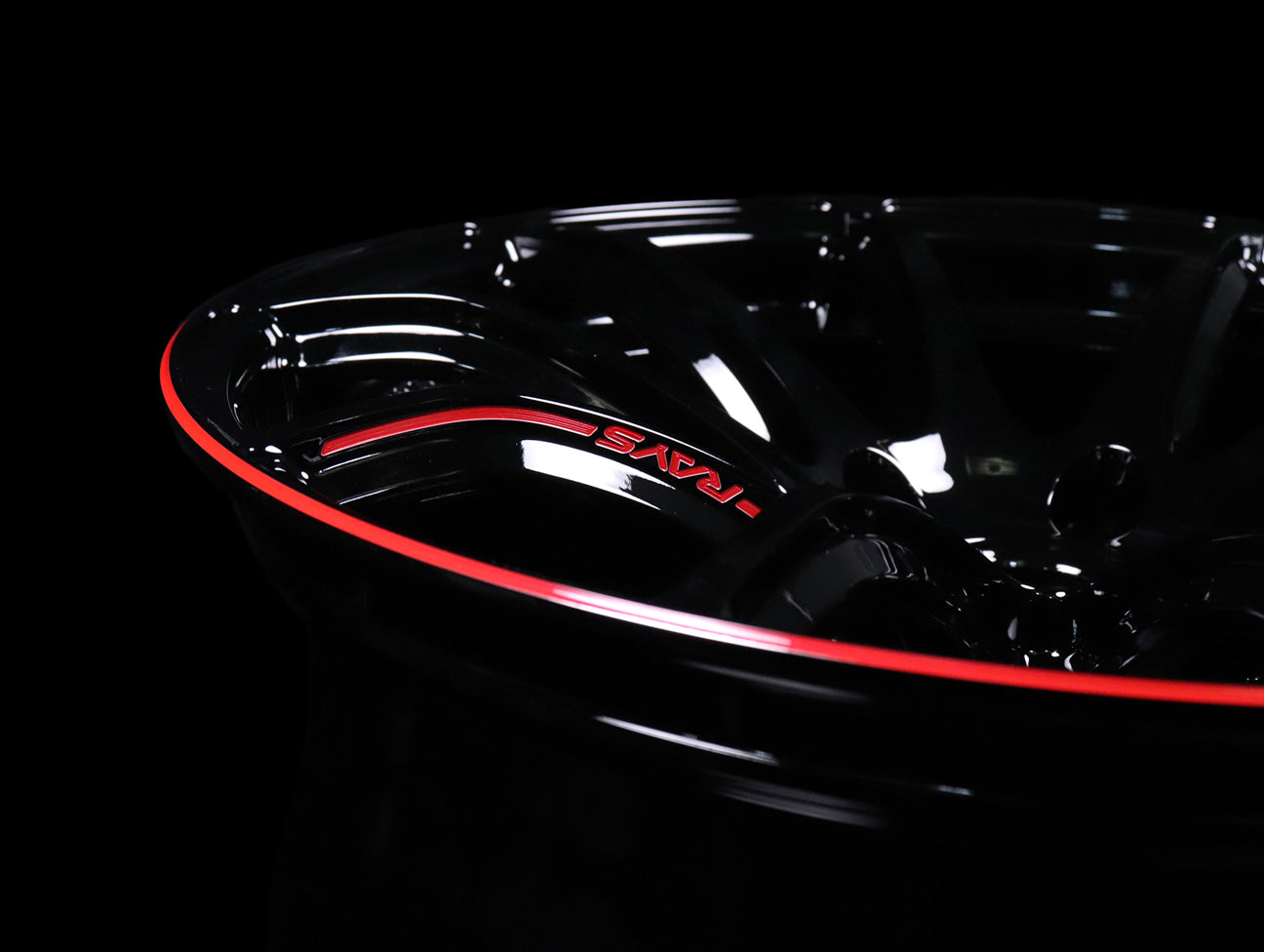 This limited production model is available in black with red accents including RAYS logo machining. The updated 5x120 bolt patterns have enlarged nut/bolt hole openings compared with the standard model, making this 14mm adaptable for Civic Type-R applications. Made in Japan.
