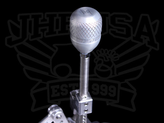 The process begins with a solid billet bar of 6061 aluminum, and each knob is machined to final size on a CNC lathe. After the lathe, the blank knobs are sent out for the anodizing process. The black is hard anodized and the silver is a regular anodize. During the final step, each knob is chucked up on a 4-Axis CNC mill to precision cut in the unique grid pattern that was designed to improve shifter grip. This final step is so critical that we actually have a 5% scrap rate. On a cable shifter setup they have found that a weighted knob can cause shifting problems for some drivers because the neutral return spring has to work harder to pull the shifter back to the center. So instead of going to the heavy side K-T found a good weight (5.5 oz) that is just enough to allow confident and accurate shifting while still keeping enough weight to help the front to back shifts.