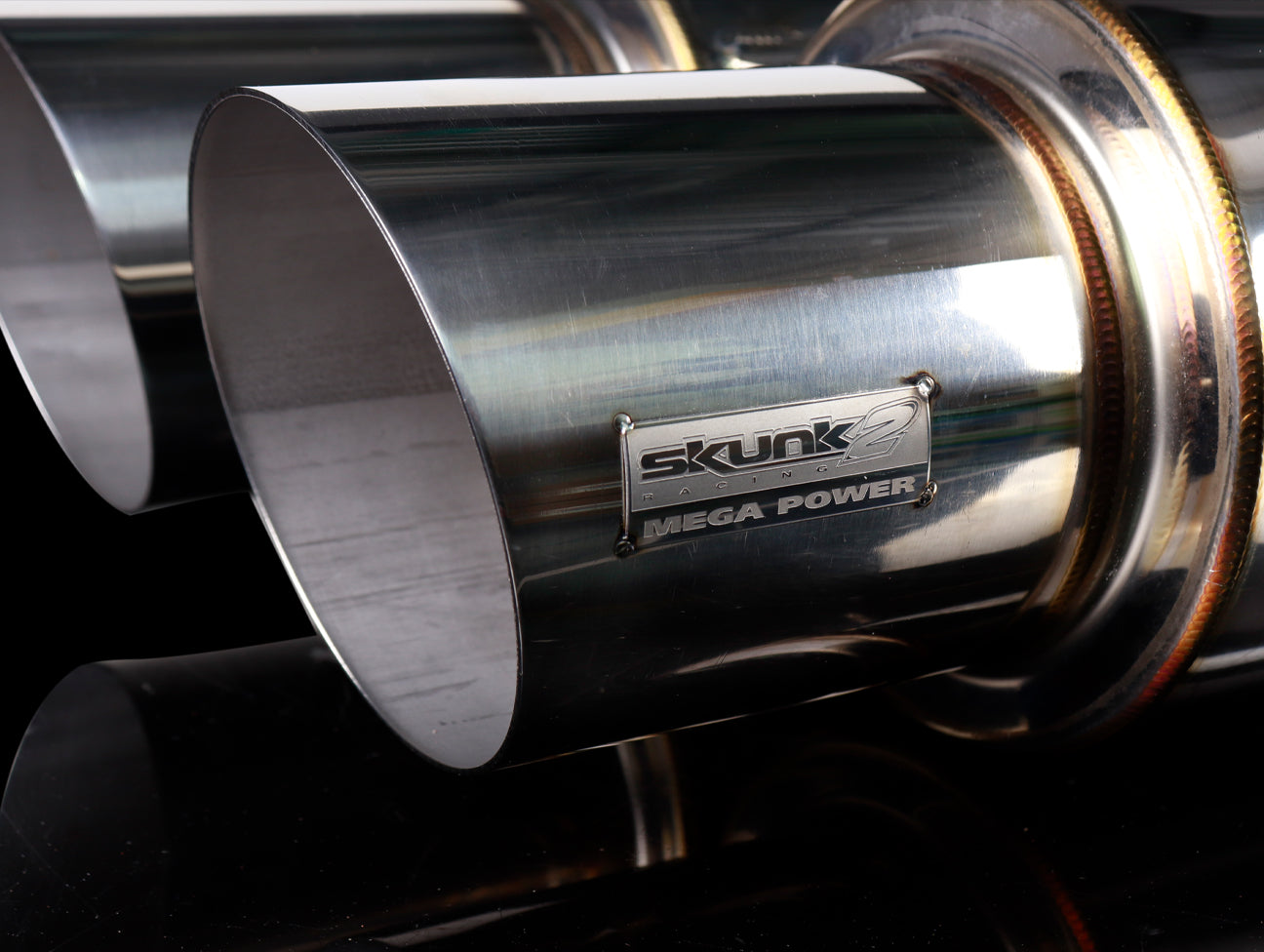 Featuring parallel, dual race mufflers mounted center beneath the bumper, this system emits that iconic, vicious Skunk2 exhaust note.