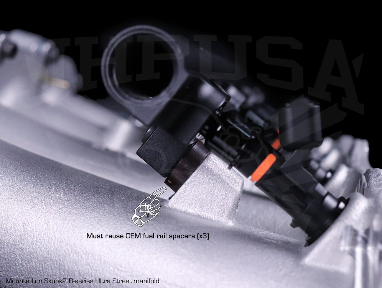 *In-house fitment test - Ultra B-series rail is compatible with the Skunk2 B-series Ultra Street manifold as well; must reuse OEM B-series fuel rail spacers.