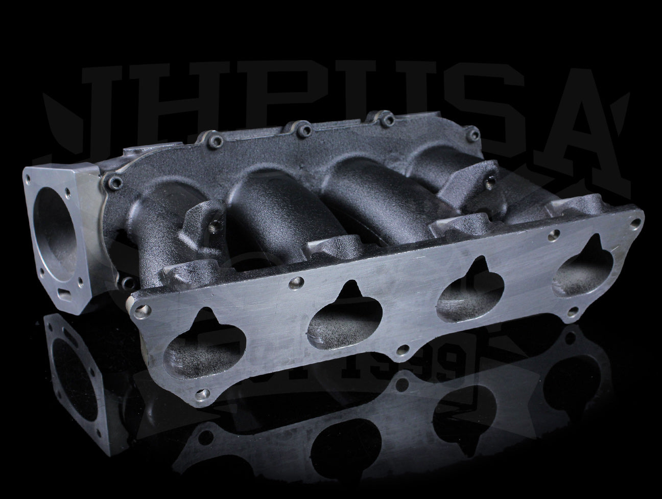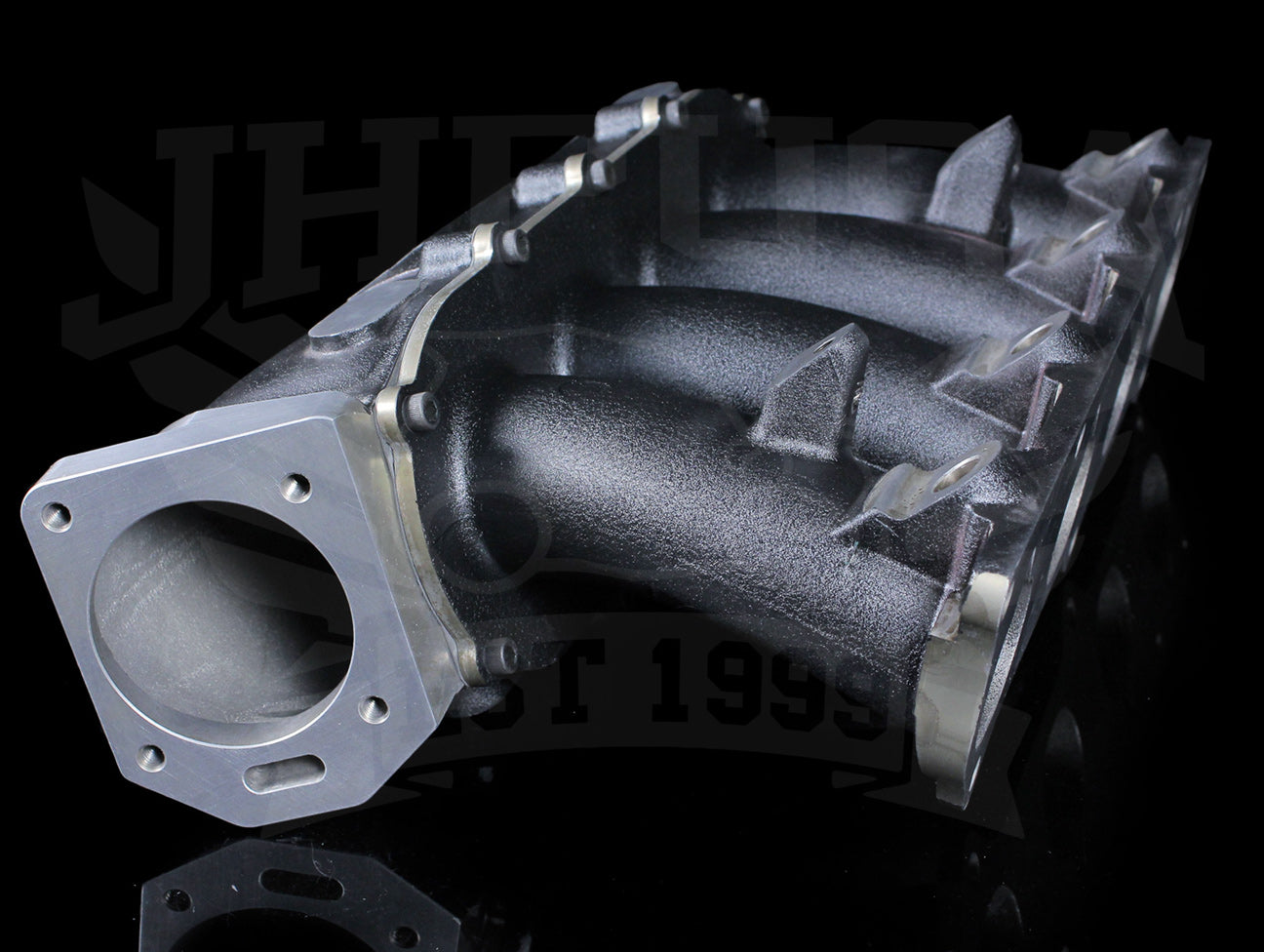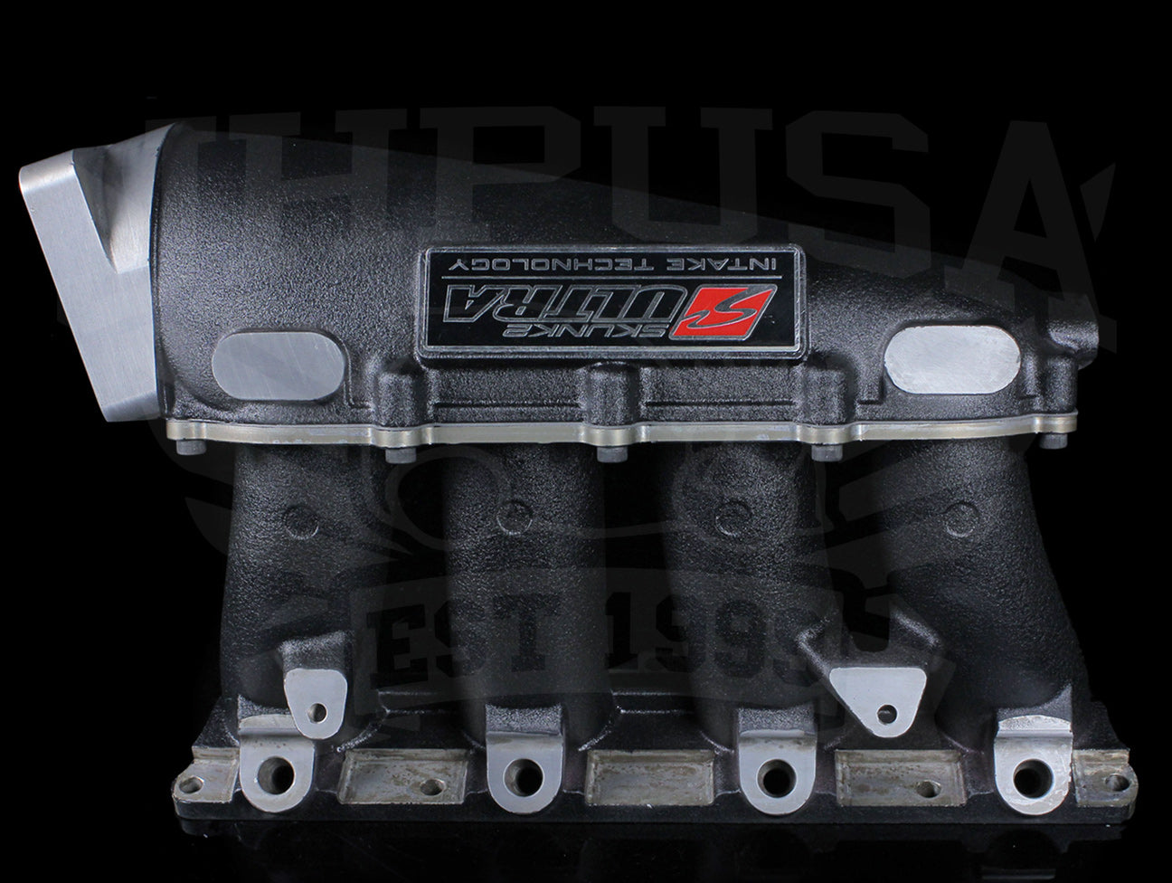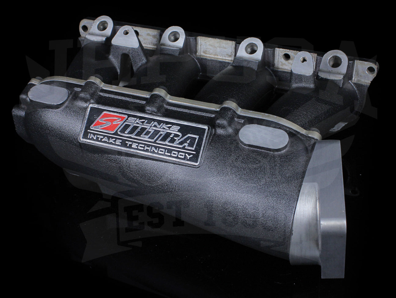 Ultra Series Street Intake Manifolds are manufactured from high grade 356 aluminum alloy for light weight and added strength over sheet metal manifolds. Each manifold is CNC-machined for a precise fit, and individually inspected for quality. The Ultra Series Street Intake Manifold features a 71mm throttle body opening and is constructed with thick walls and entry, minimizing concerns of breakthrough when port matching. The 1.82L plenum distributes even airflow to all four cylinders under dynamic load conditions. Placement and design of the, rigorously, flow tested velocity stacks ensure maximum delivery of air to the cylinder. The large velocity stack and raised bell mouth entries lead to long, 8.72”, intake runners with smooth transitions allowing the Ultra Series Street Intake Manifold to outperform the competition. Designed to be used with modified street applications and mild turbo setups, the Skunk2 Ultra Series Street Intake Manifold provides a new level of affordable high-end intake technology to the marketplace.