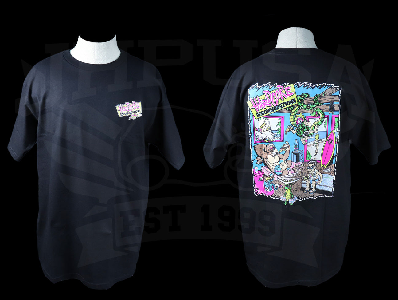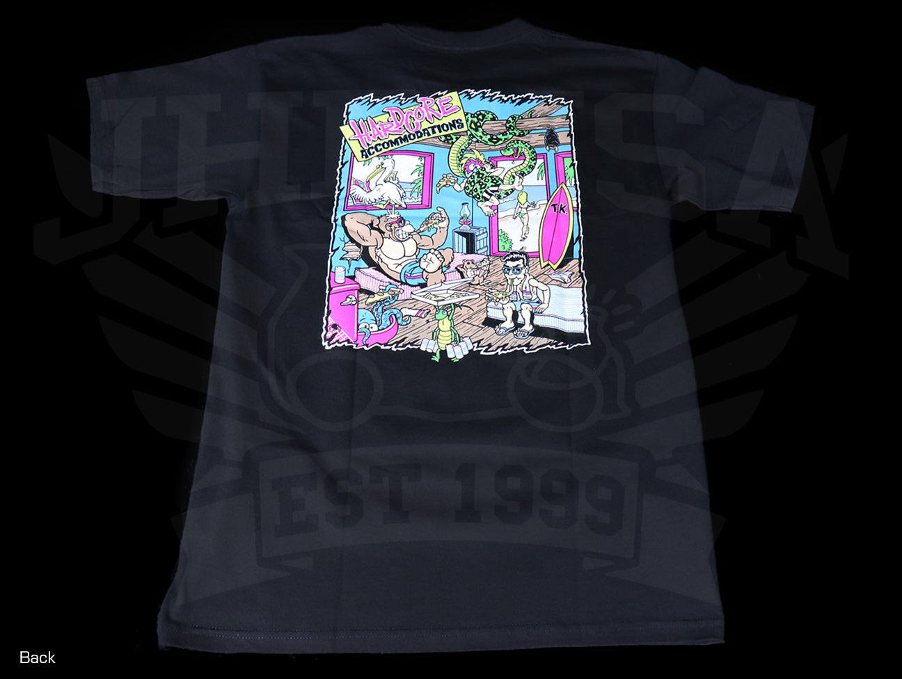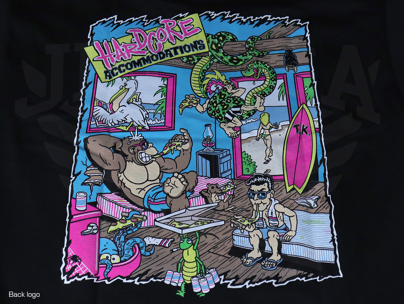 Surf back to the 80's in retro beach apparel with Thrilla Gorilla and Da'Boys! Originally a classic 80's sticker illustration, Hardcore Accommodations is back! Available for the first time as a graphic tee, this rebooted 80's art by Steve Nazar features all Da Boys: Thrilla Gorilla, Primal Pete, The Wave Warrior Tiki, and Joe Cool. Great for the beach, skating, or the street.