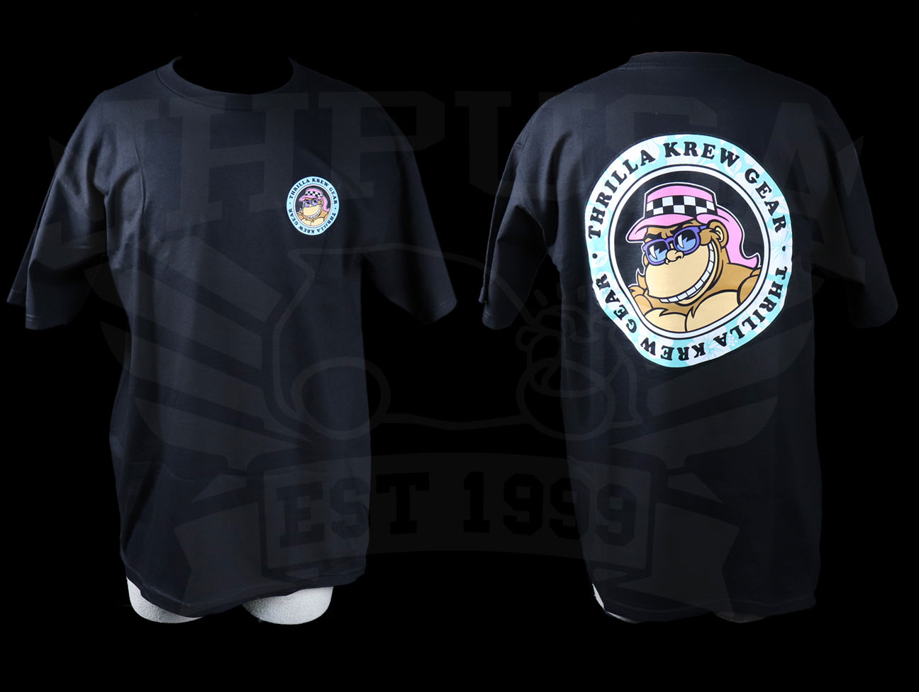 Surf back to the 80's in retro beach apparel with Thrilla Gorilla and Da'Boys! The Thrilla Gorilla floral dot logo graphic tee features new art by Steve Nazar with graphic treatments on both the chest and back. Great for the beach, skating, or the street!