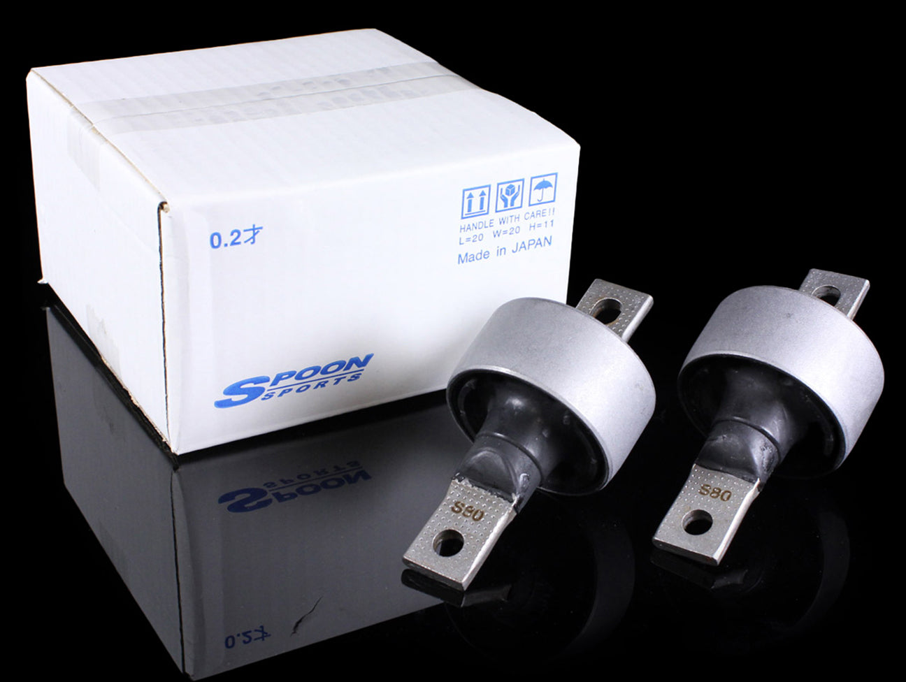The Spoon Sports rear trailing arm bushings feature increased rigidity over the standard RTA bushings to increase the suspension performance, feel, and handling but without losing overall compliance.