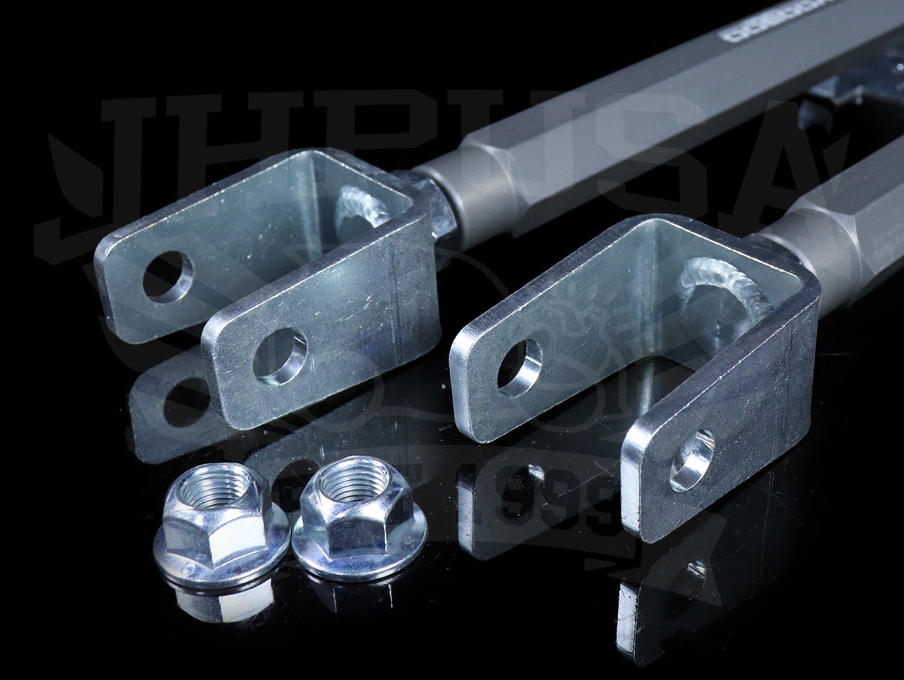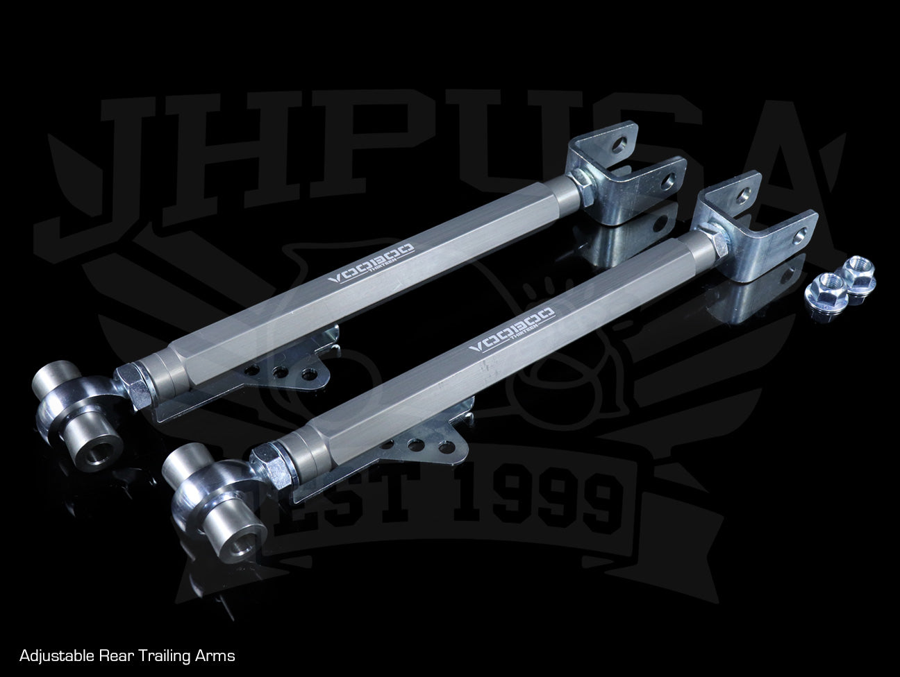 Voodoo 13 arms are engineered and designed for high performance street and race vehicles. They replace the soft rubber OE bushings with rigid spherical bearings for increased handling and performance, but may slightly sacrifice noise and comfort compared to arms that use rubber bushings. The adjusting rods are made from 6061-T6 aluminum which ensures our arms are incredibly strong and lightweight. MIL-A-8625 Type III Hard Clear anodize finish. Voodoo 13 steel brackets are CNC manufactured with TIG welded construction. CNC stainless steel spacers are machined in house and work in conjunction with high quality made in the USA QA1 spherical rod ends. Class 10.9 zinc coated nuts included to replace the factory welded on nuts (camber and trailing arms).