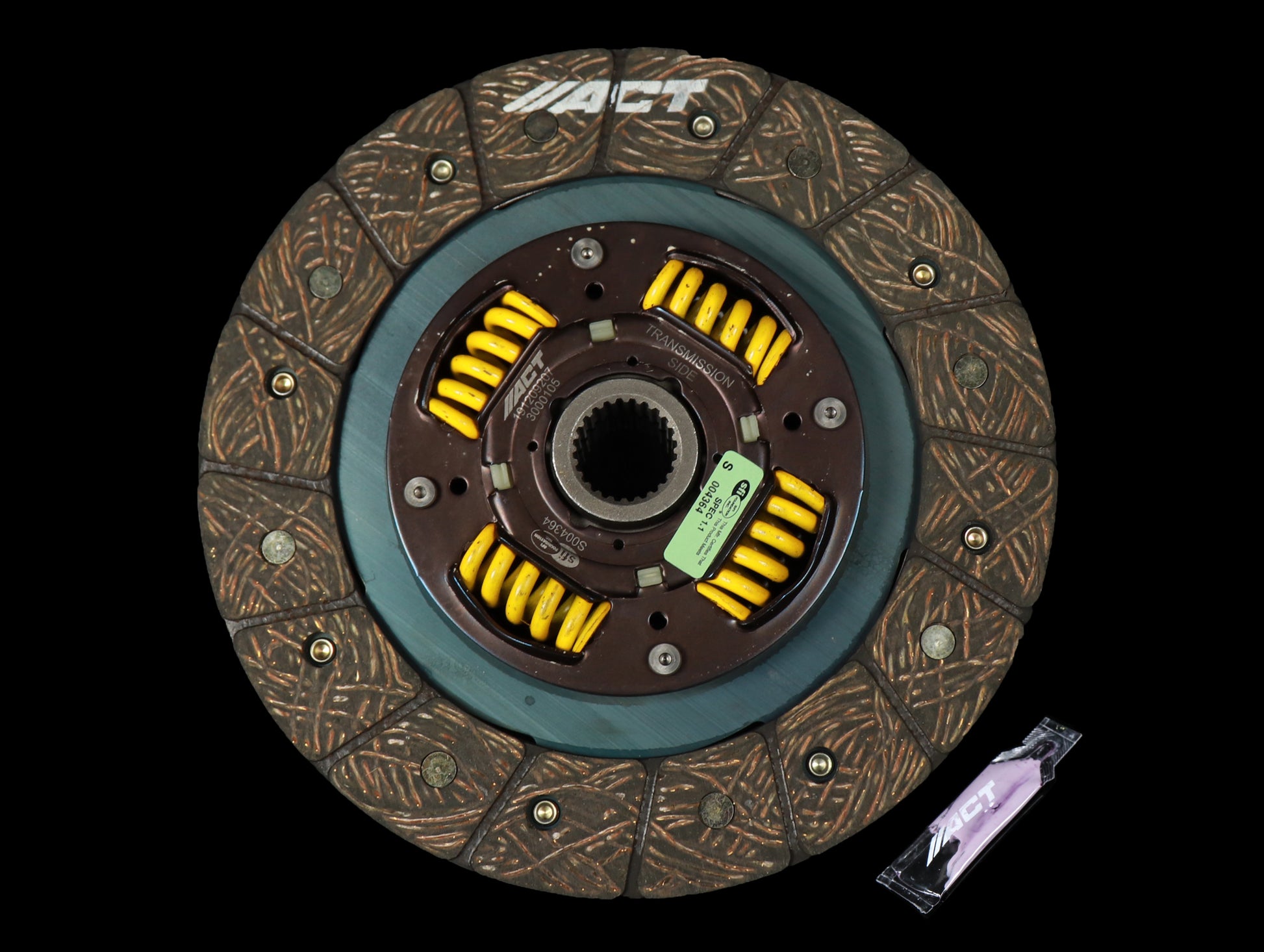 The ACT performance street disc is the most popular disc purchased. It features premium organic materials with high copper content for better heat transfer. Performance street discs allow for quicker shifting and smooth engagement. These discs feature a reduced marcel for faster shift action to complement ACT pressure plates. ACT spring-centered assemblies use bushings and cone springs similar to factory clutch discs. This creates frictional dampening, which improves clutch life and reduces noise. Quiet operation with increased strength and reliability.