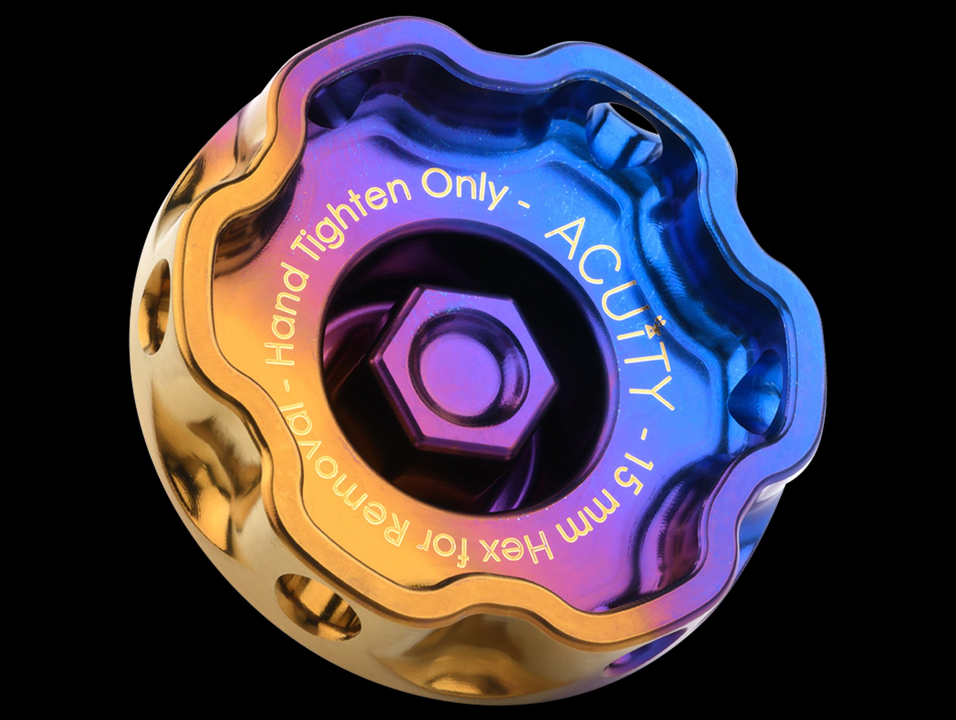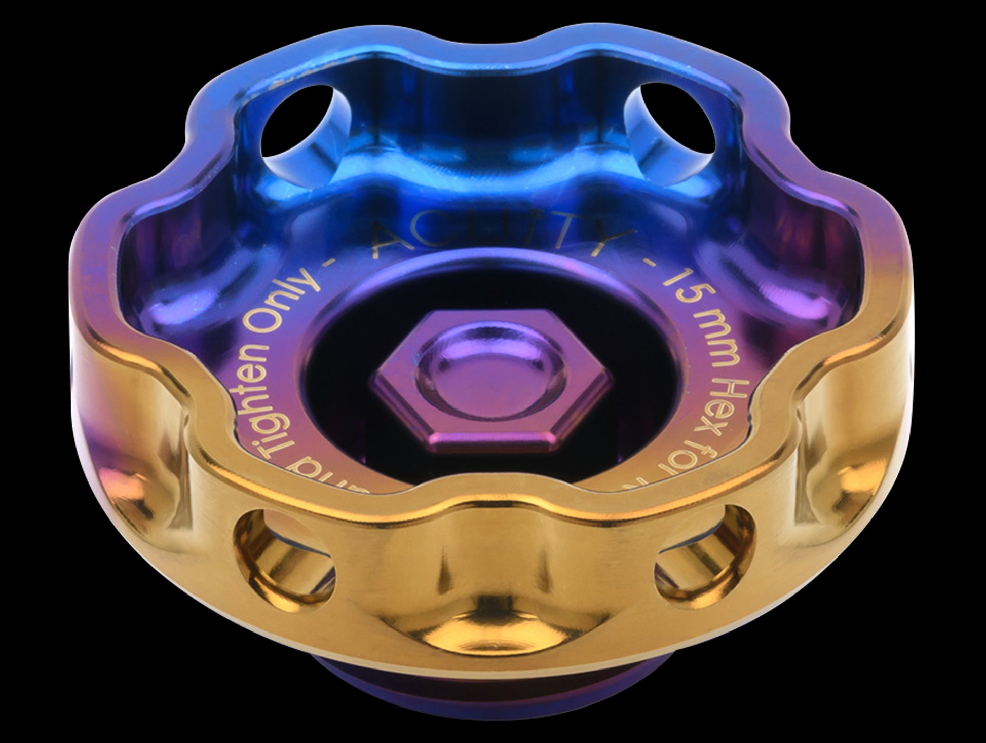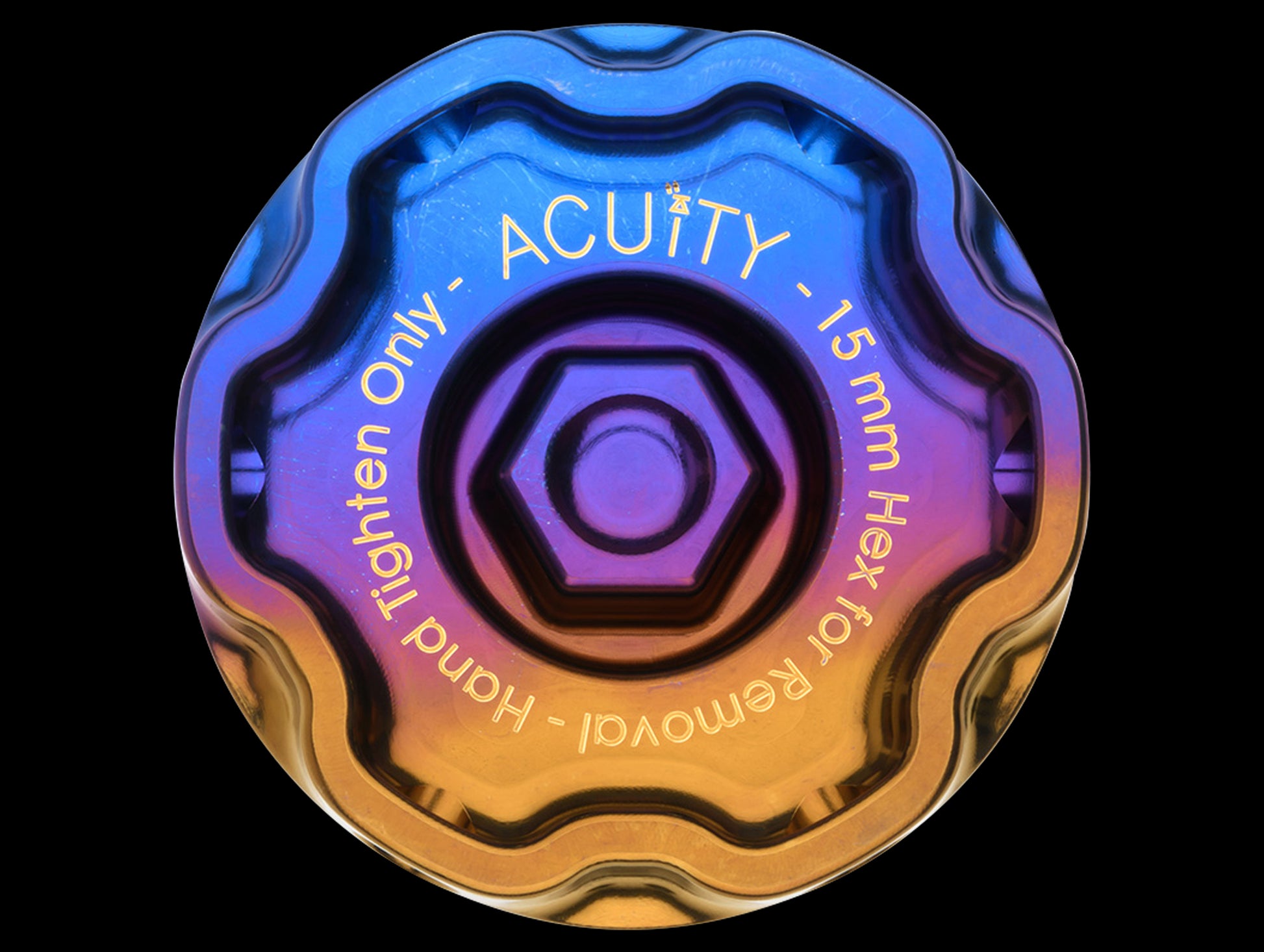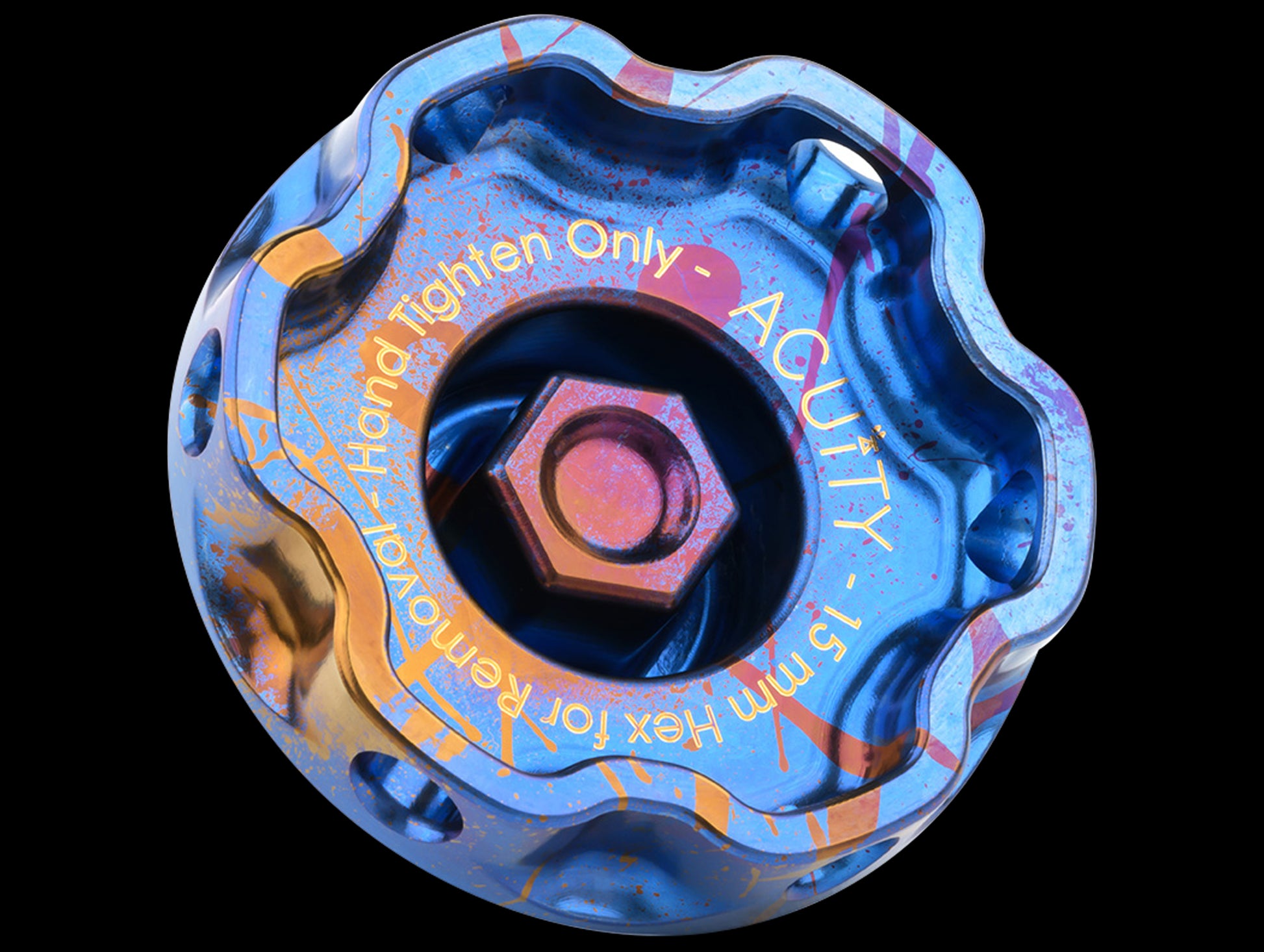 The Podium-Ti Oil Cap by ACUiTY is meant to shine when others would leave you in a literal bind. Most gearheads have struggled to remove a stuck oil cap at some point. The Podium-Ti gracefully avoids such issues thanks to its cross-drilled holes and machined hex that allow removal using a screwdriver or socket. Of course, it also permits hand removal using its gently scalloped profile. The Podium-Ti is carefully machined from 6AL4V titanium, and the finish is applied by hand, making every piece unique. Attention to detail abounds in this design with subtle features like a dovetailed o-ring retention groove, helpful technical markings, and critically placed fillets to help keep the oil cap looking great even after repeated loosening using tools. With its titanium construction, beautiful finish, artful design, and surprisingly light weight, it's clear the Podium-Ti is meant to be more than just a beautiful addition to your race car.