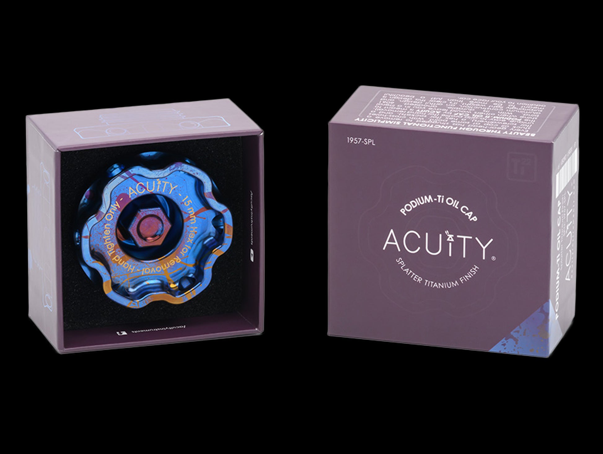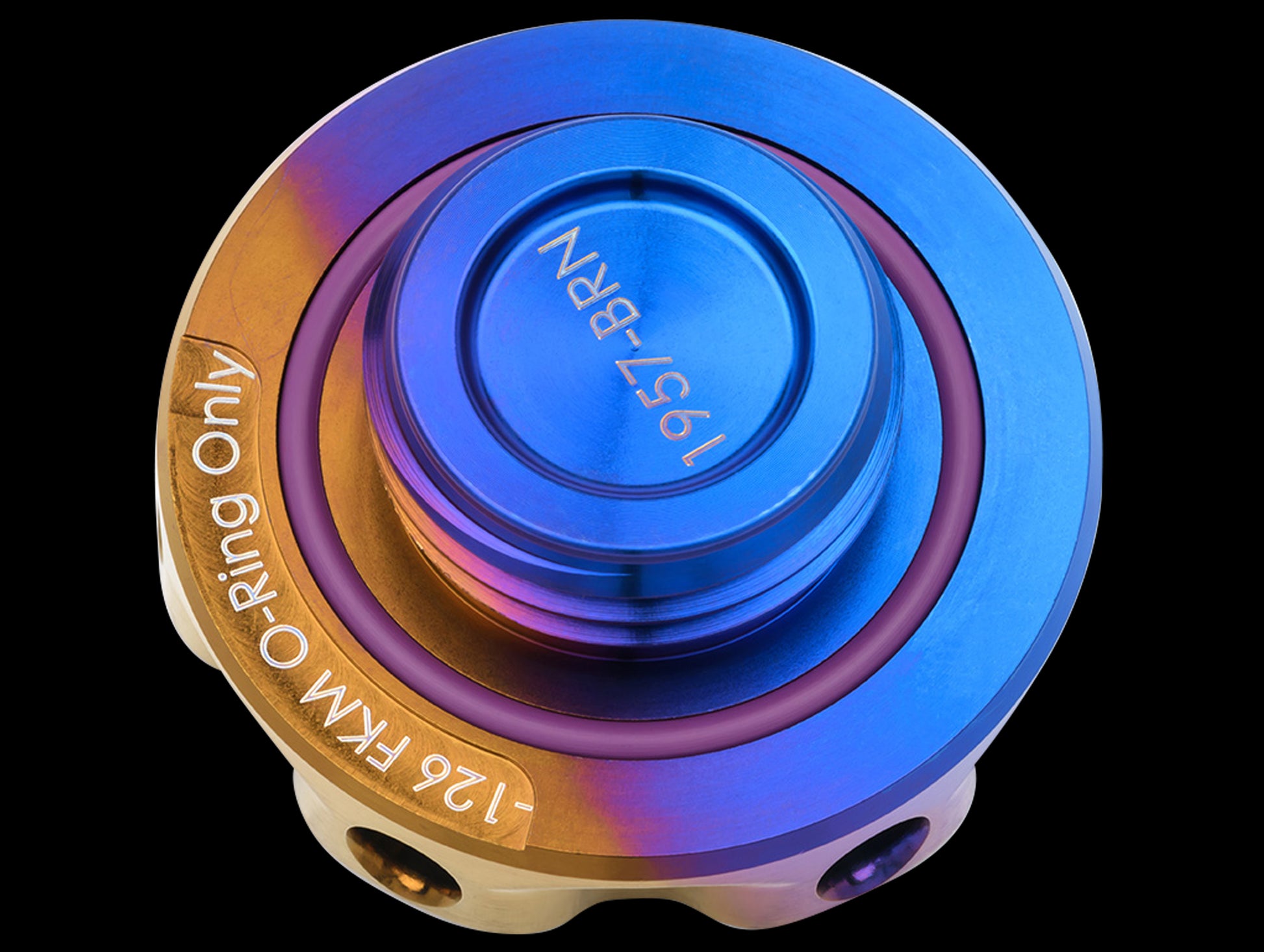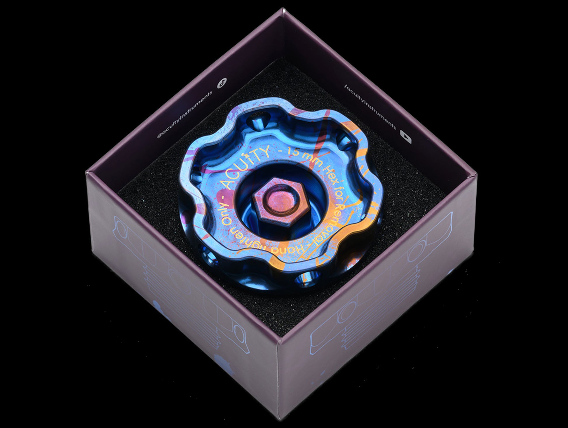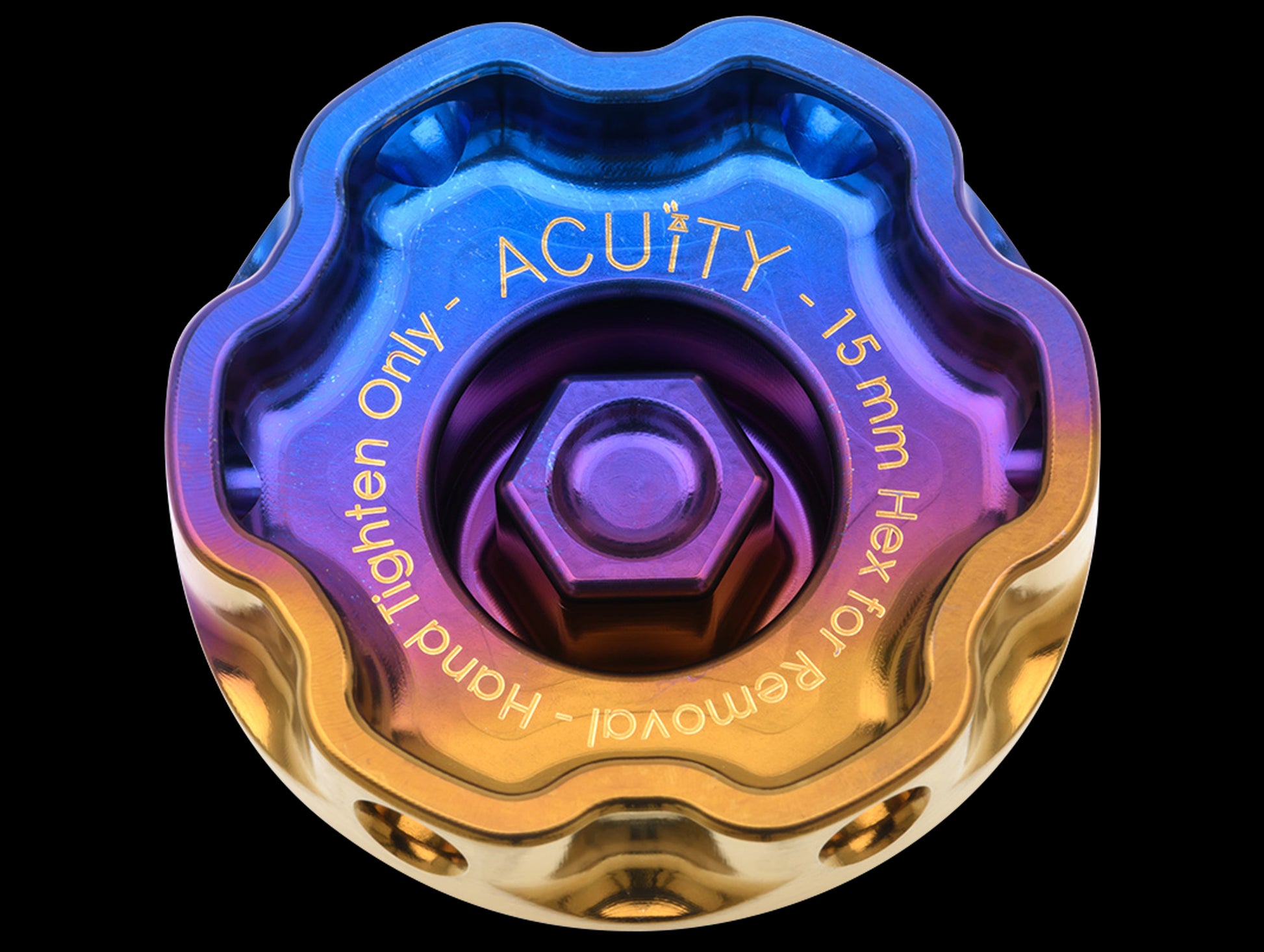 The Podium-Ti Oil Cap by ACUiTY is meant to shine when others would leave you in a literal bind. Most gearheads have struggled to remove a stuck oil cap at some point. The Podium-Ti gracefully avoids such issues thanks to its cross-drilled holes and machined hex that allow removal using a screwdriver or socket. Of course, it also permits hand removal using its gently scalloped profile. The Podium-Ti is carefully machined from 6AL4V titanium, and the finish is applied by hand, making every piece unique. Attention to detail abounds in this design with subtle features like a dovetailed o-ring retention groove, helpful technical markings, and critically placed fillets to help keep the oil cap looking great even after repeated loosening using tools. With its titanium construction, beautiful finish, artful design, and surprisingly light weight, it's clear the Podium-Ti is meant to be more than just a beautiful addition to your race car.