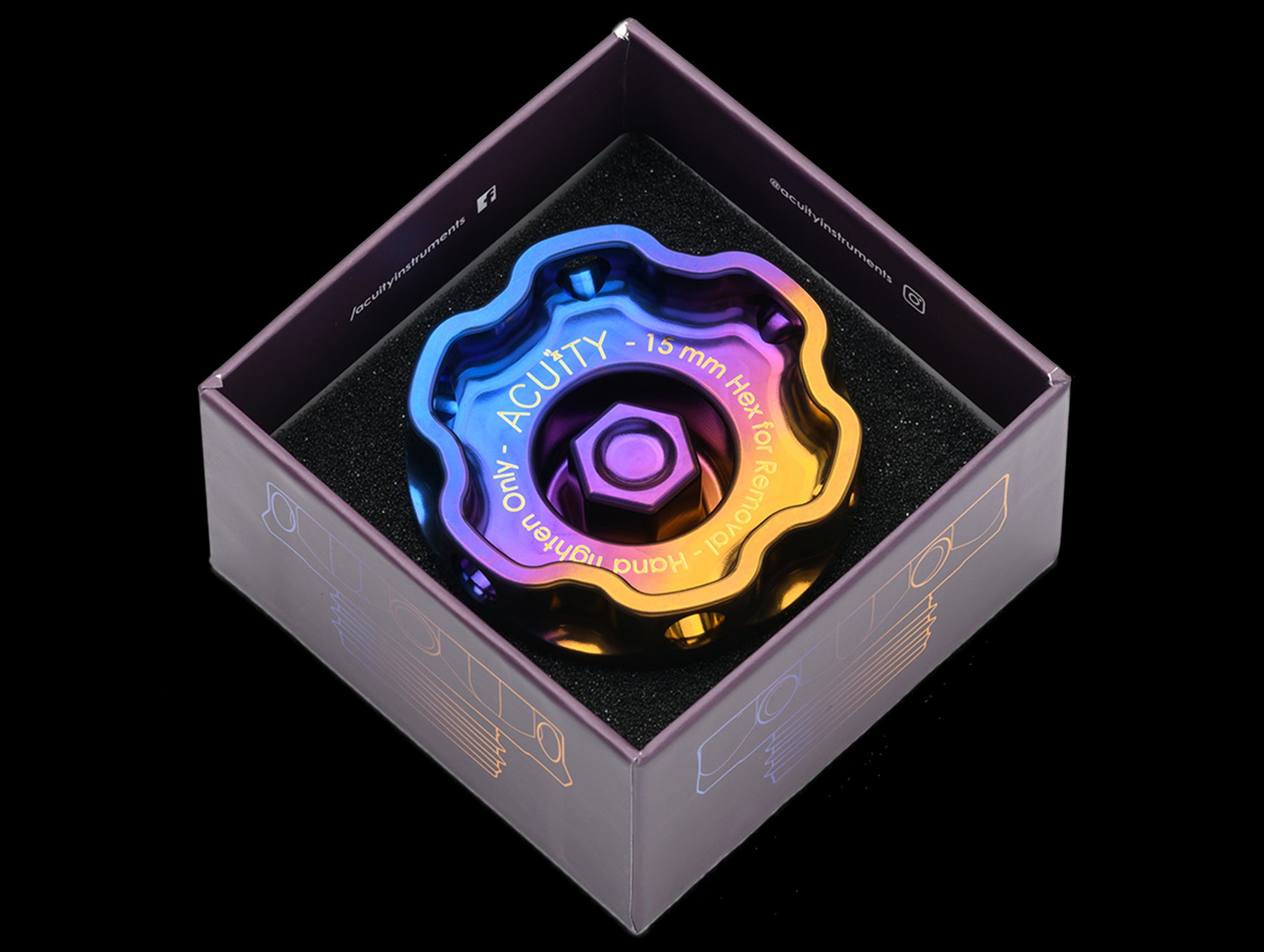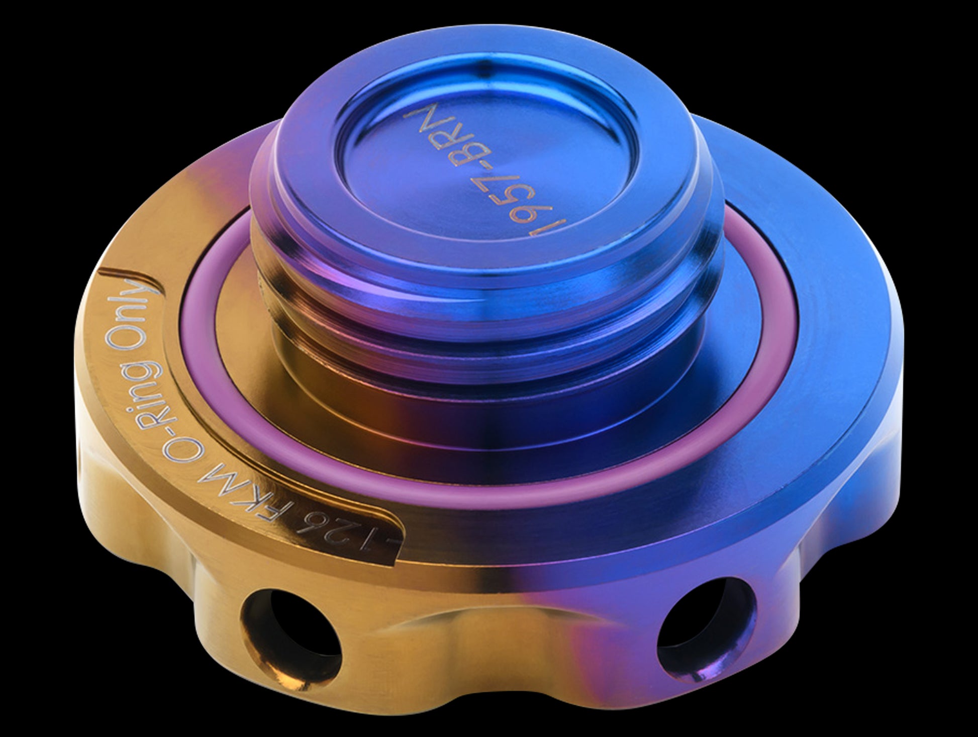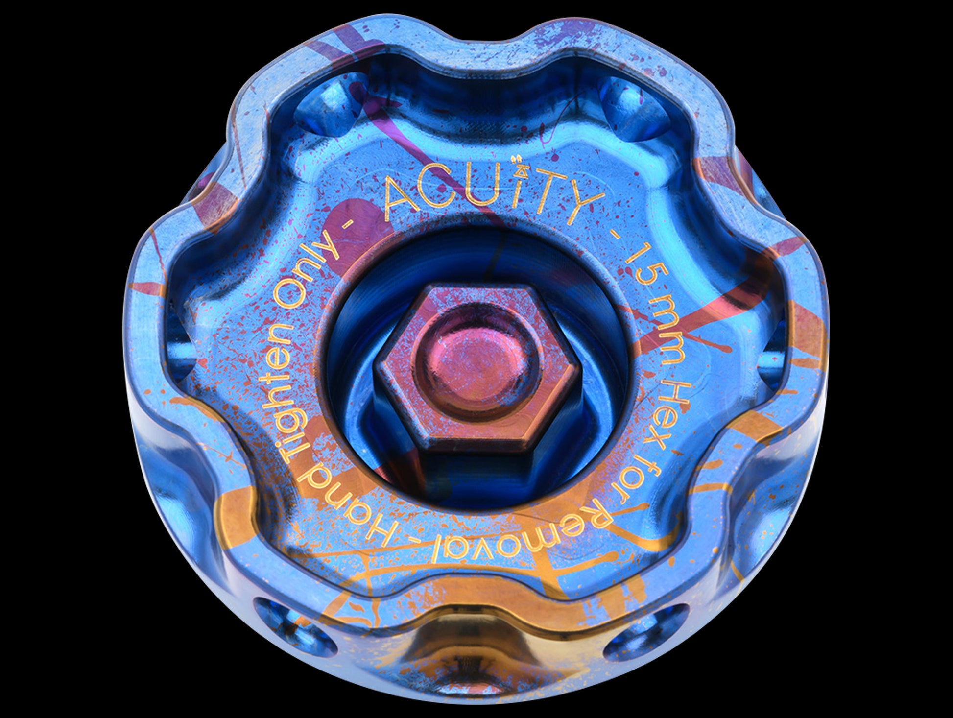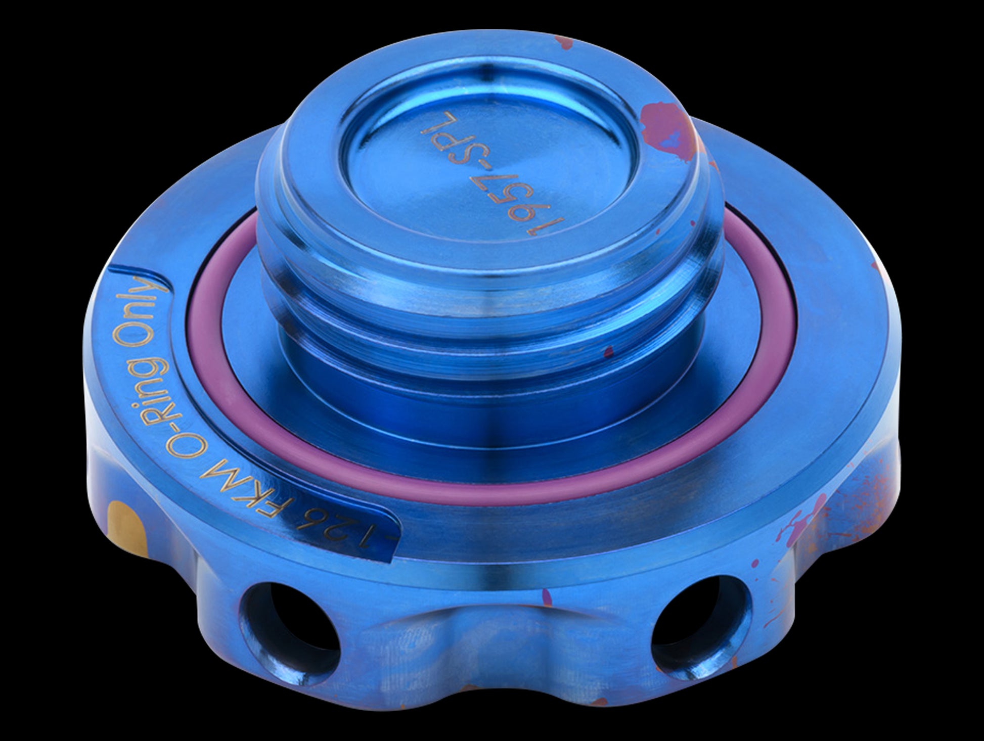 The Podium-Ti Oil Cap by ACUiTY is meant to shine when others would leave you in a literal bind. Most gearheads have struggled to remove a stuck oil cap at some point. The Podium-Ti gracefully avoids such issues thanks to its cross-drilled holes and machined hex that allow removal using a screwdriver or socket. Of course, it also permits hand removal using its gently scalloped profile. The Podium-Ti is carefully machined from 6AL4V titanium, and the finish is applied by hand, making every piece unique. Attention to detail abounds in this design with subtle features like a dovetailed o-ring retention groove, helpful technical markings, and critically placed fillets to help keep the oil cap looking great even after repeated loosening using tools. With its titanium construction, beautiful finish, artful design, and surprisingly light weight, it's clear the Podium-Ti is meant to be more than just a beautiful addition to your race car.