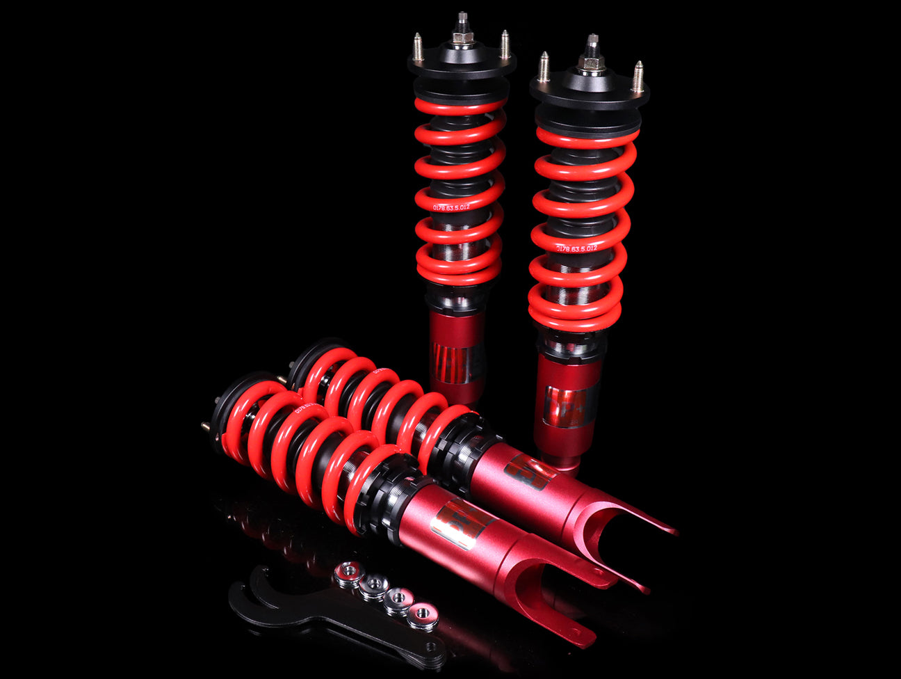 Each kit comes with 24-way adjustable struts, specifically weighted front and rear coil springs, adjustable perches, pillow ball upper mounts and billet aluminum lower adjustable mounts for EG/DC and EK or ITR control arms. Each kit also includes new dust covers, bump stops and spanner wrench set.