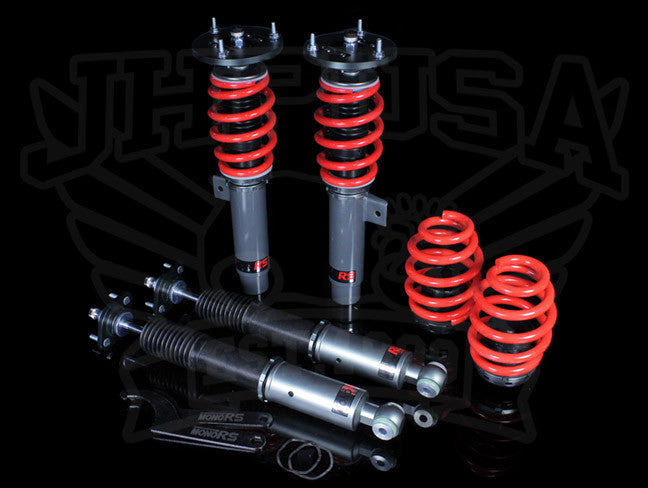 Godspeed Project's Mono RS is their single-adjustable coilover suspension kit designed for both race and street use. The Mono RS coilovers features a 53mm monotube shock and cold wounded springs that are made from high strength SAE9252 steel to optimize the balance between performance and comfort. A monotube design separates the gas and shock oil which yields consistent shock performance lap after lap. The top hat is attached to the car via a pillowball mount that incorporates high performance Japanese KOYO 6204Z bearing. The Mono RS offers 32 damper adjustments which adjusts both rebound and compression. Godspeed coilover suspension kits include a 1 year warranty.