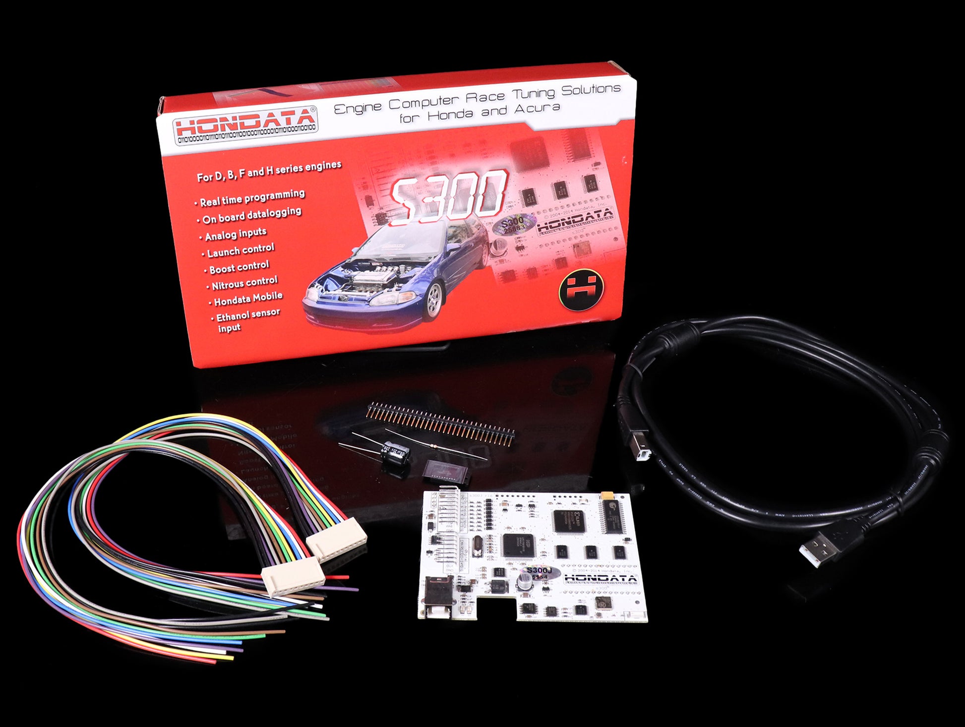The Hondata S300 is a plug in module to the factory Honda Engine Computer (ECU) which vastly expands the capabilities of the factory ECU. Forced induction, data logging, real time updating of parameters, engine protection are but a few of the s300 features. The s300 uses different connecting pins in the ECU from the s100/s200, and also has a slot cut in the side for the USB connector, so the ECU must be modified for use with the s300.