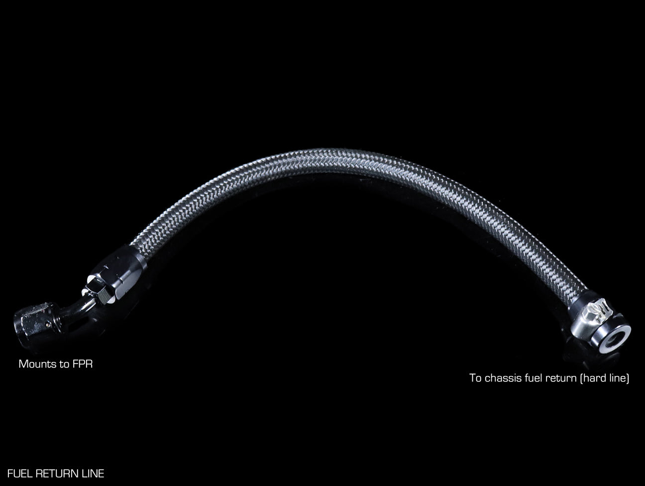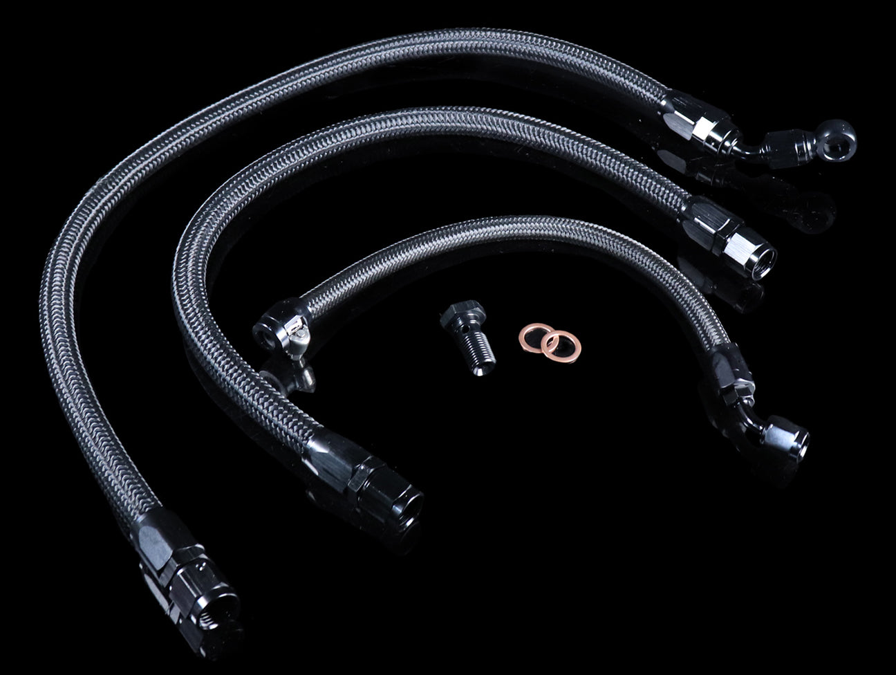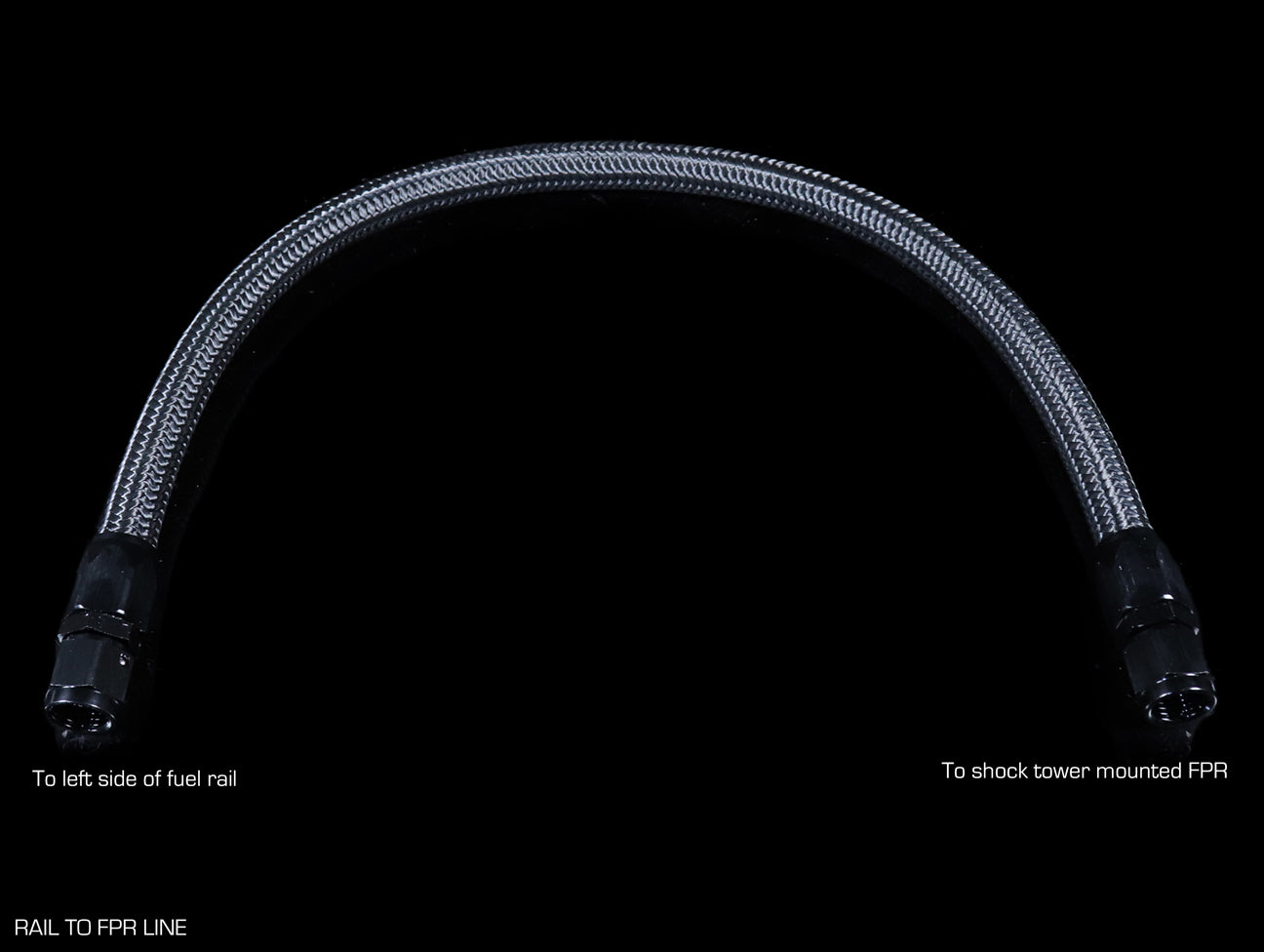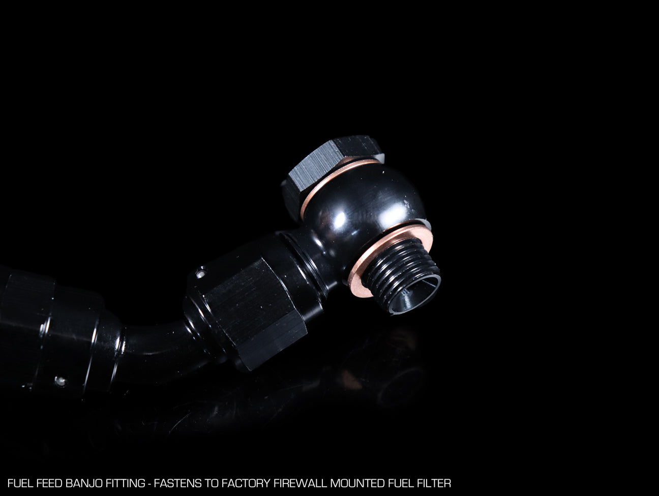 This kit comes with 3 black nylon lines with the appropriate fittings pre-installed on the ends. The black nylon offers a stealthy look! The kit also comes with three -6AN unions, a banjo fitting to connect to your OEM firewall mounted fuel filter and an adapter to connect to your hard line.