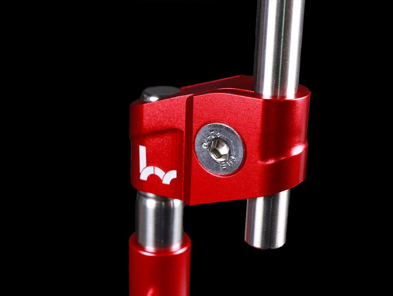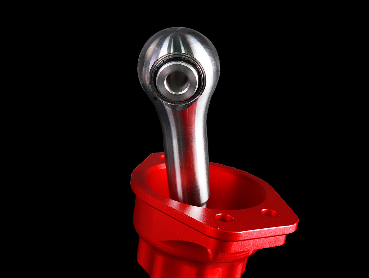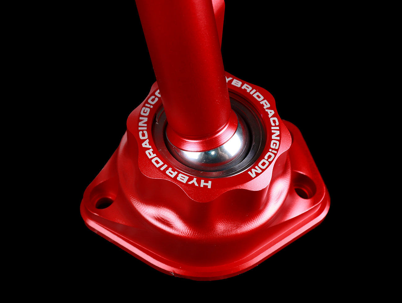 One of the most radical features of the HR shifter is the top mount rigid base. The rigid base is machined from 6061 aluminum and houses a spherical bearing which allows for smooth operation; eliminating all of the OEM plastic bushings. This design enables us to raise the pivot point allowing HR to achieve short shifts at higher knob positions. The added stability of the rigid base keeps shifts tight and direct while racing.