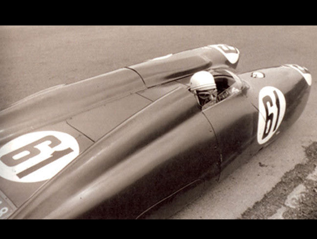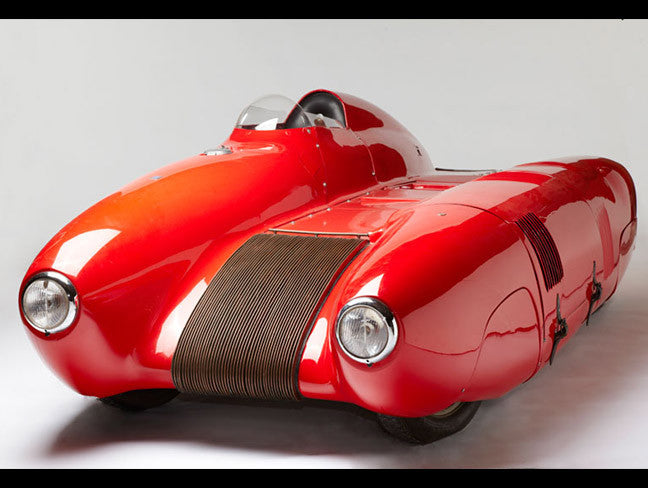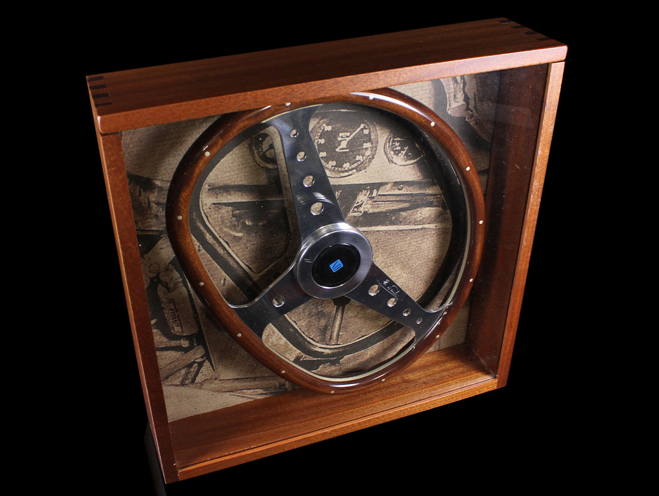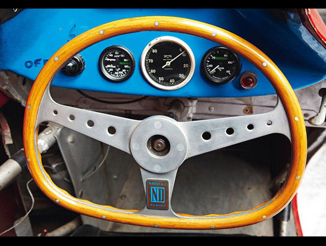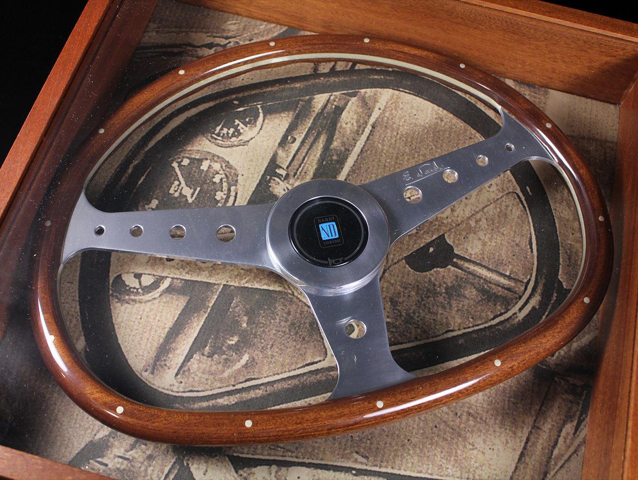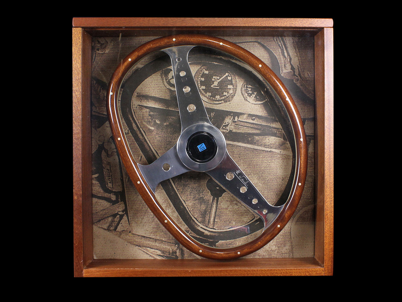 This is a reproduction of the steering wheel mounted in the "Nardi Bisiluro" which participated at the Le Mans "24 Hours" in 1955. The "Bisiluro" or "Twin Torpedo" was a vehicle which housed the driver and fuel tank in the right of fuselage, while in the left fuselage the engine and transmission were mounted. Up front, in the middle there was the radiator.
