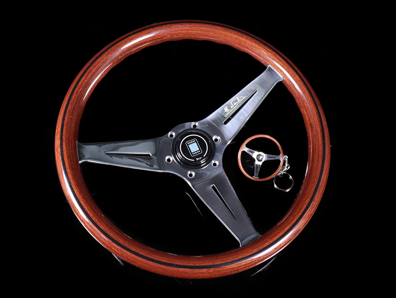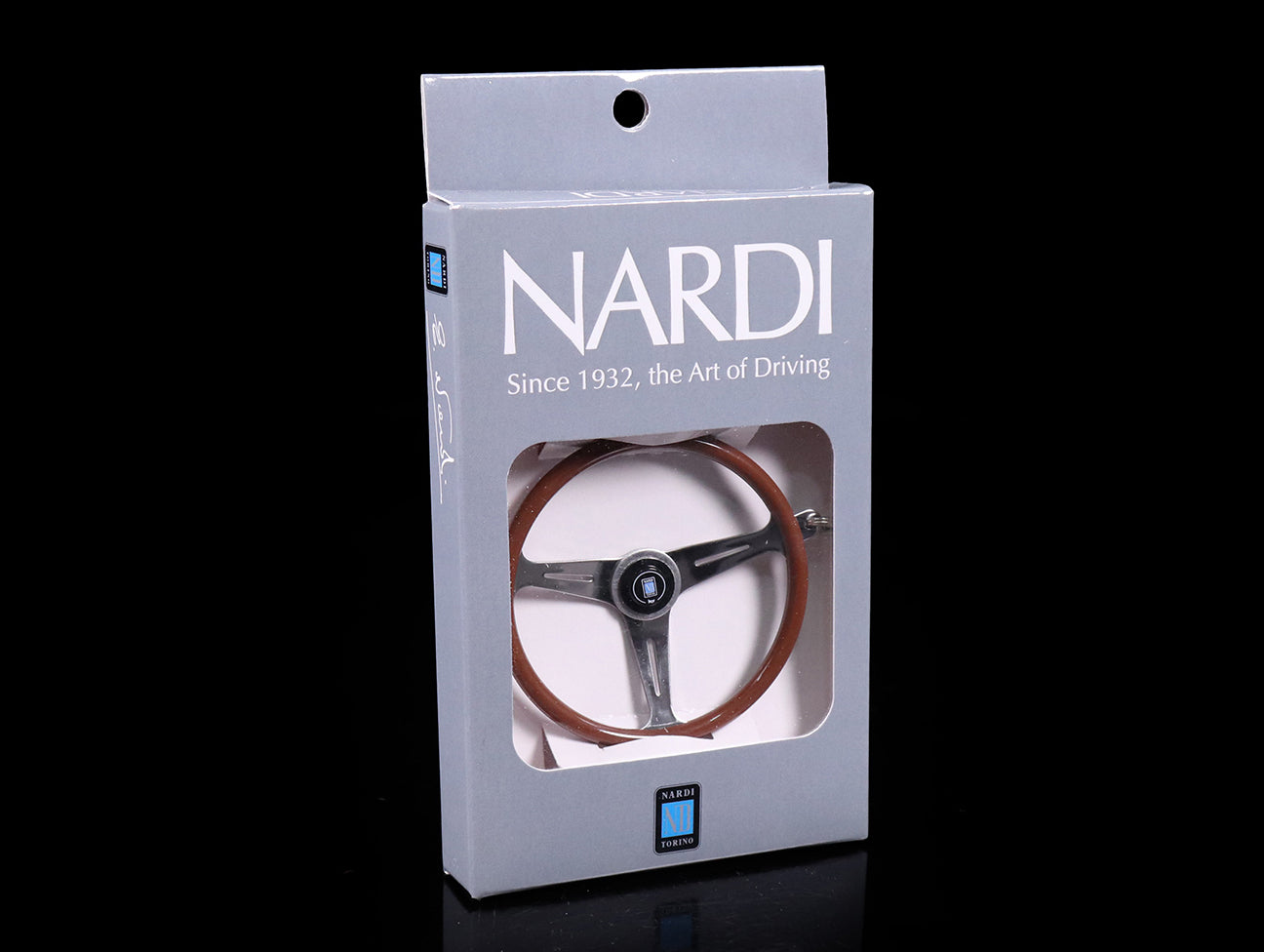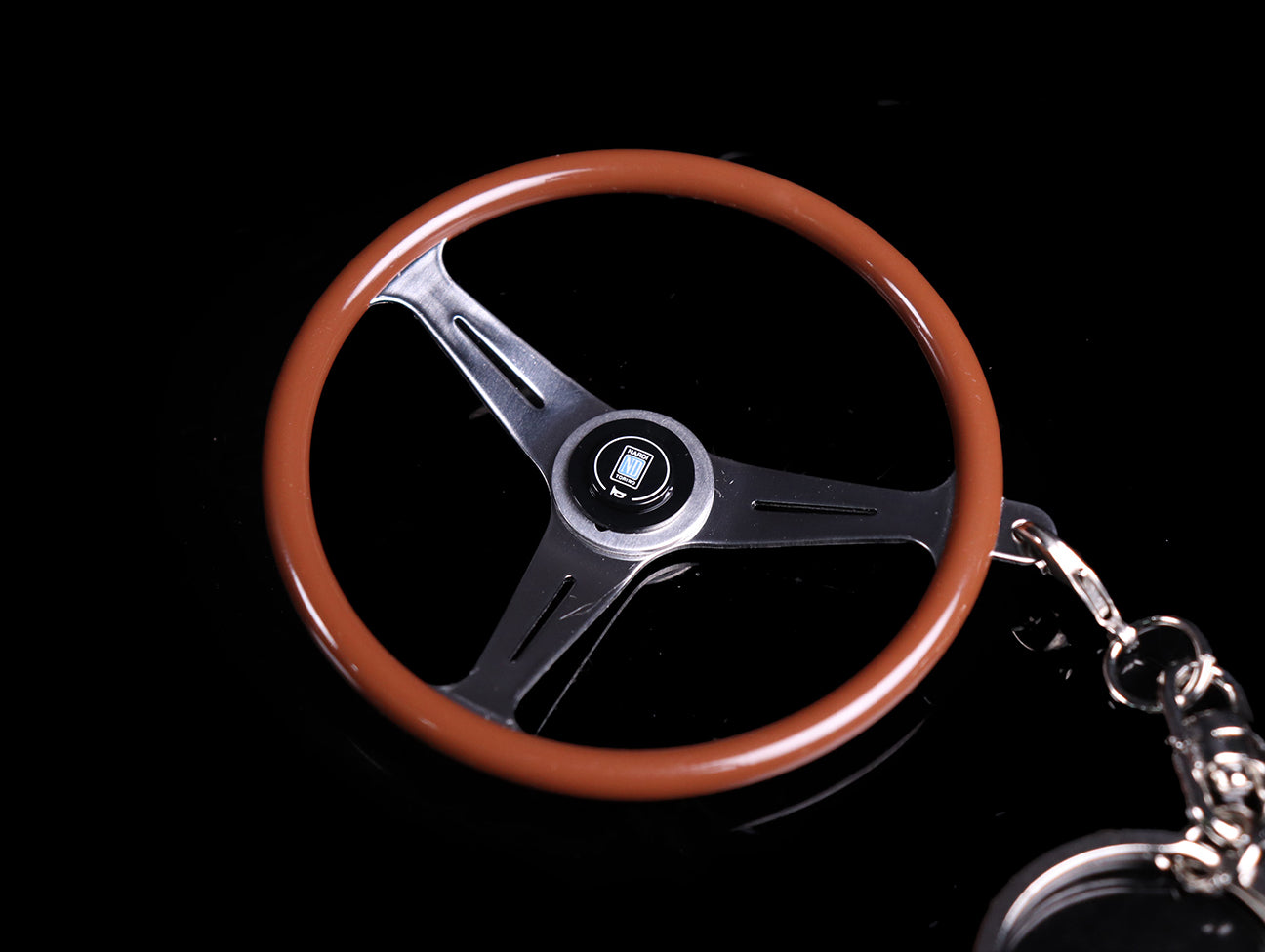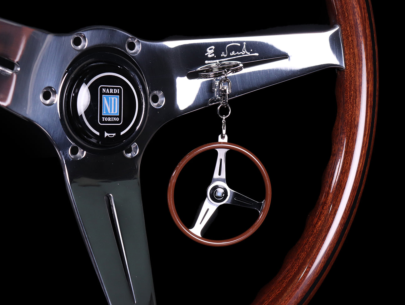 The Nardi Classic series steering wheel keyholder features a miniature version of the Nardi Classic wood steering wheel. The wheel itself is not made of wood but of plastic mimicking the original. The detailed spokes and horn button are where the details really shine. Spokes are available in a polished or black finish. The chain and ring hang from the right side of the wheel/right spoke.