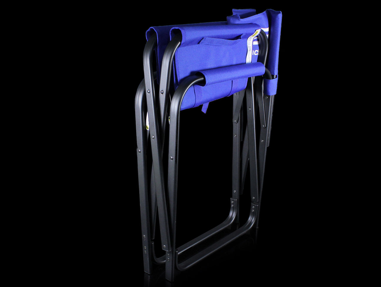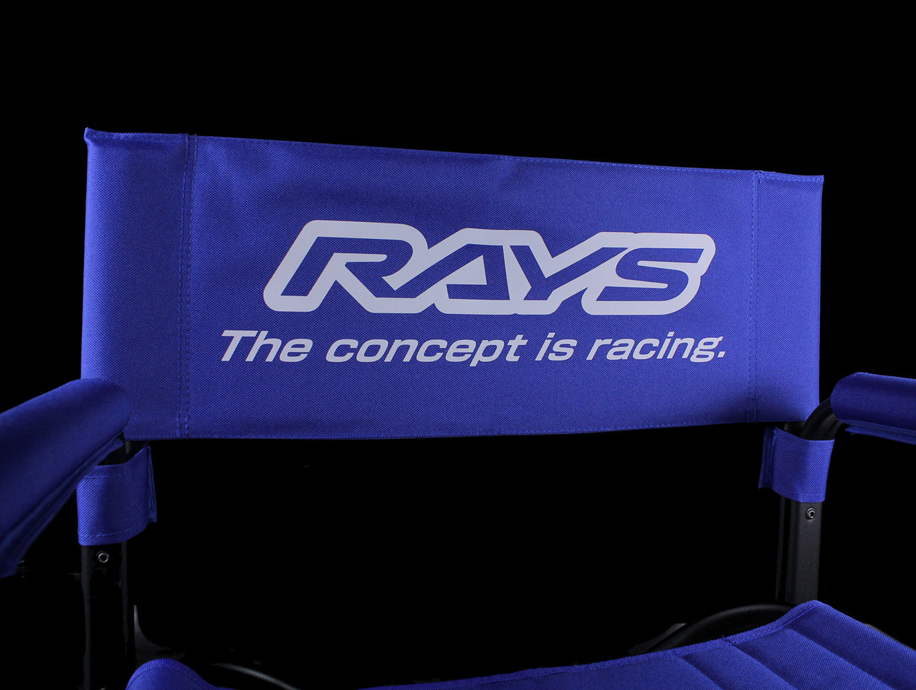 Ray's folding chair is great for usage at outdoor events including booth/tents as well as in the garage and pit for motorsport activities. Blue polyester fabric with white RAYS logo.