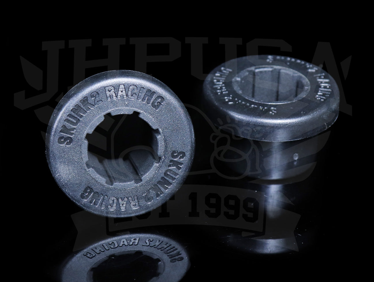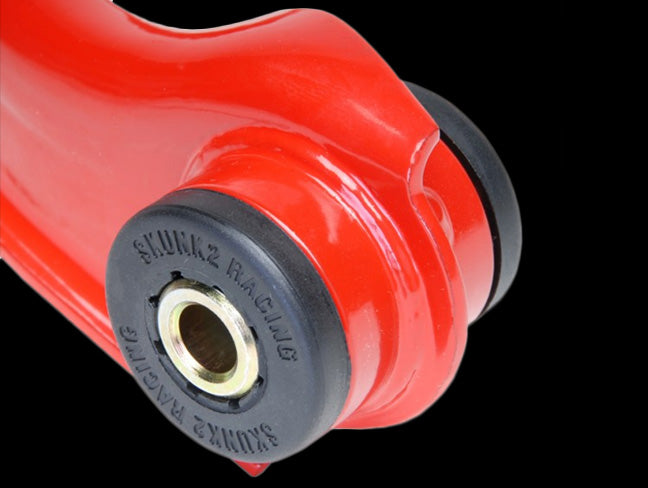 Genuine Skunk2 polyurethane bushings act as bearings for quicker response and a more positive feel when compared to other manufacturers' bushings. Tearing and unseating problems normally associated with other fixed rubber bushings are eliminated by allowing the arm to rotate freely about the bushings. Fewer grooves within the inner diameter as well as special, radiused backsides help them last longer and avoid tearing and unseating. Thanks to the new design, bushing failures have been eliminated.