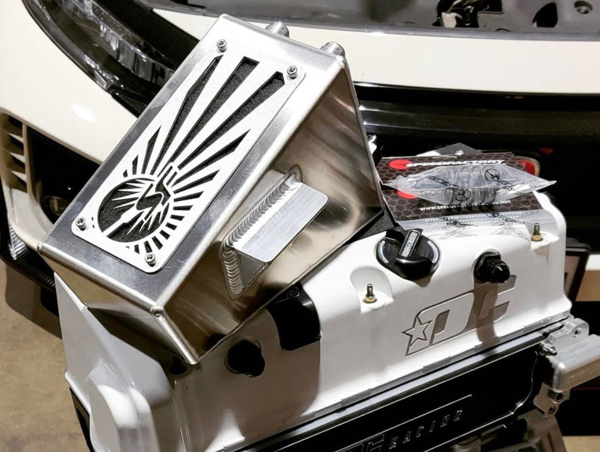 The SpeedFactory Racing Rising Sun Angled Oil Catch Can is specifically designed for forced induction and heavily modified naturally aspirated engines. This large-capacity breather setup is engineered to provide the sufficient crankcase ventilation your high performance engine needs, and also condenses crankcase blow-by oil and moisture correctly. The factory PCV system is replaced and all oil vapors are vented to the atmosphere through the laser cut logo.