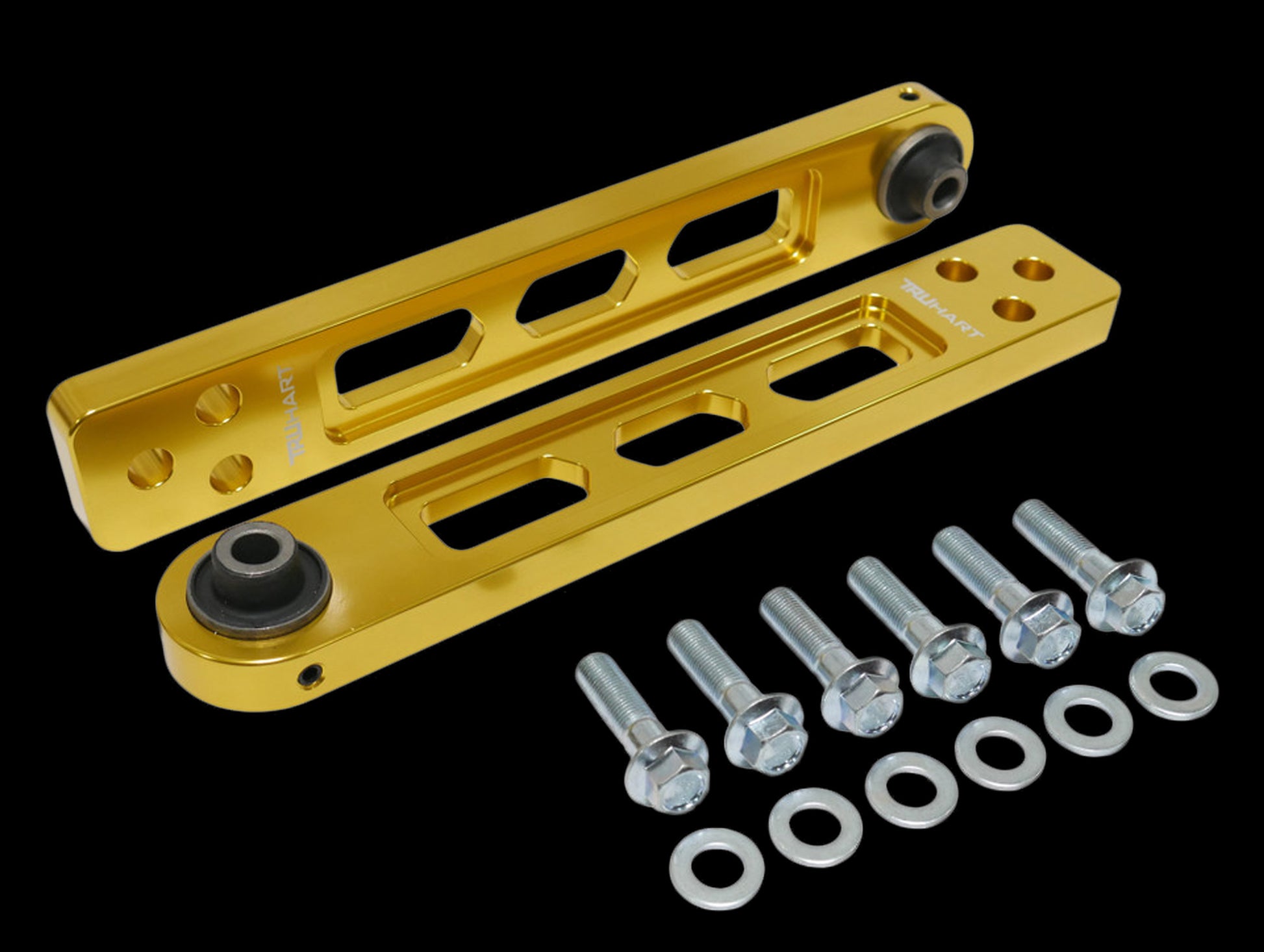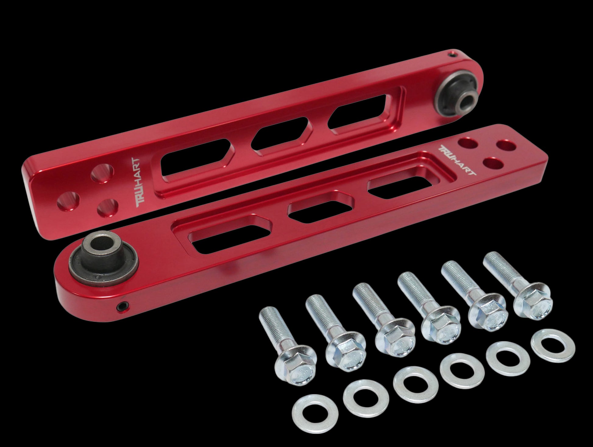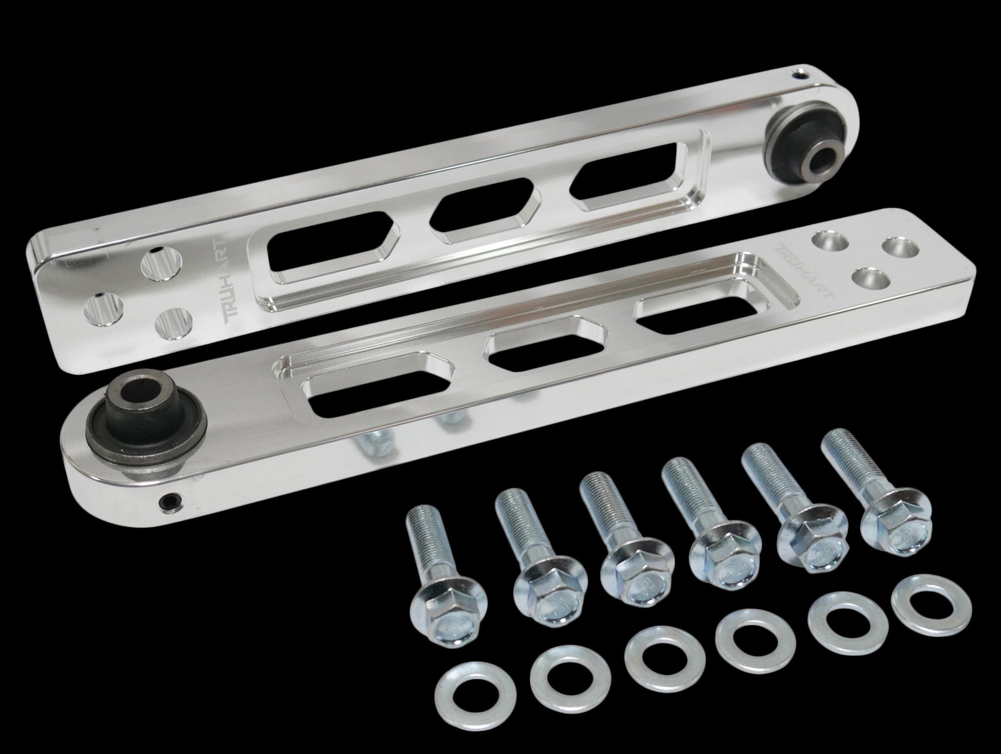 TruHart rear lower control arms are CNC machined from billet aluminum and offer a weight reduction from OEM arms by roughly 25%. In addition to providing an aesthetic upgrade, TruHart arms utilize hardened rubber bushings which allow less deflection and provide a more direct feel road feel than OE bushings. Anodized finish with laser etched TruHart logo.