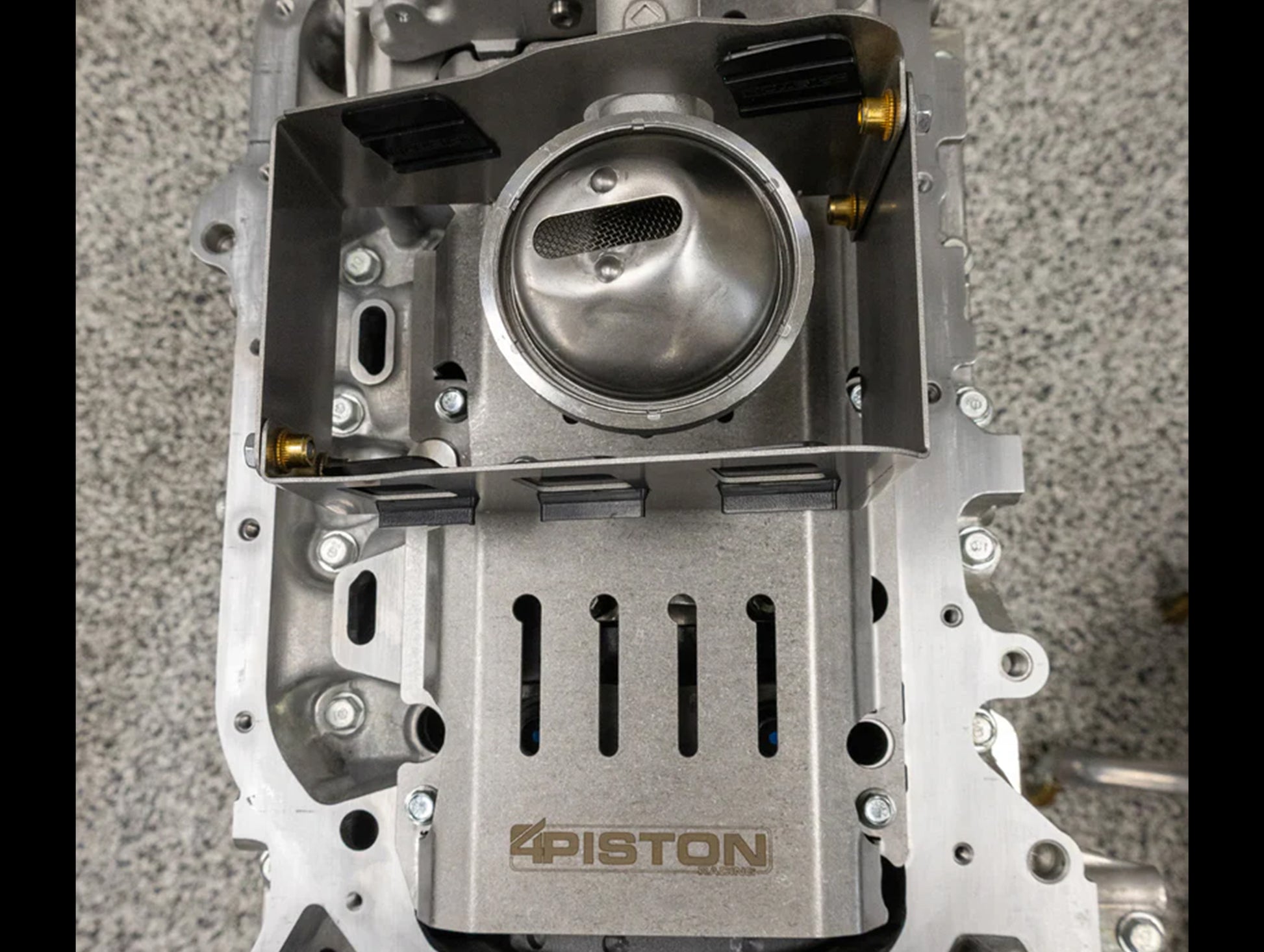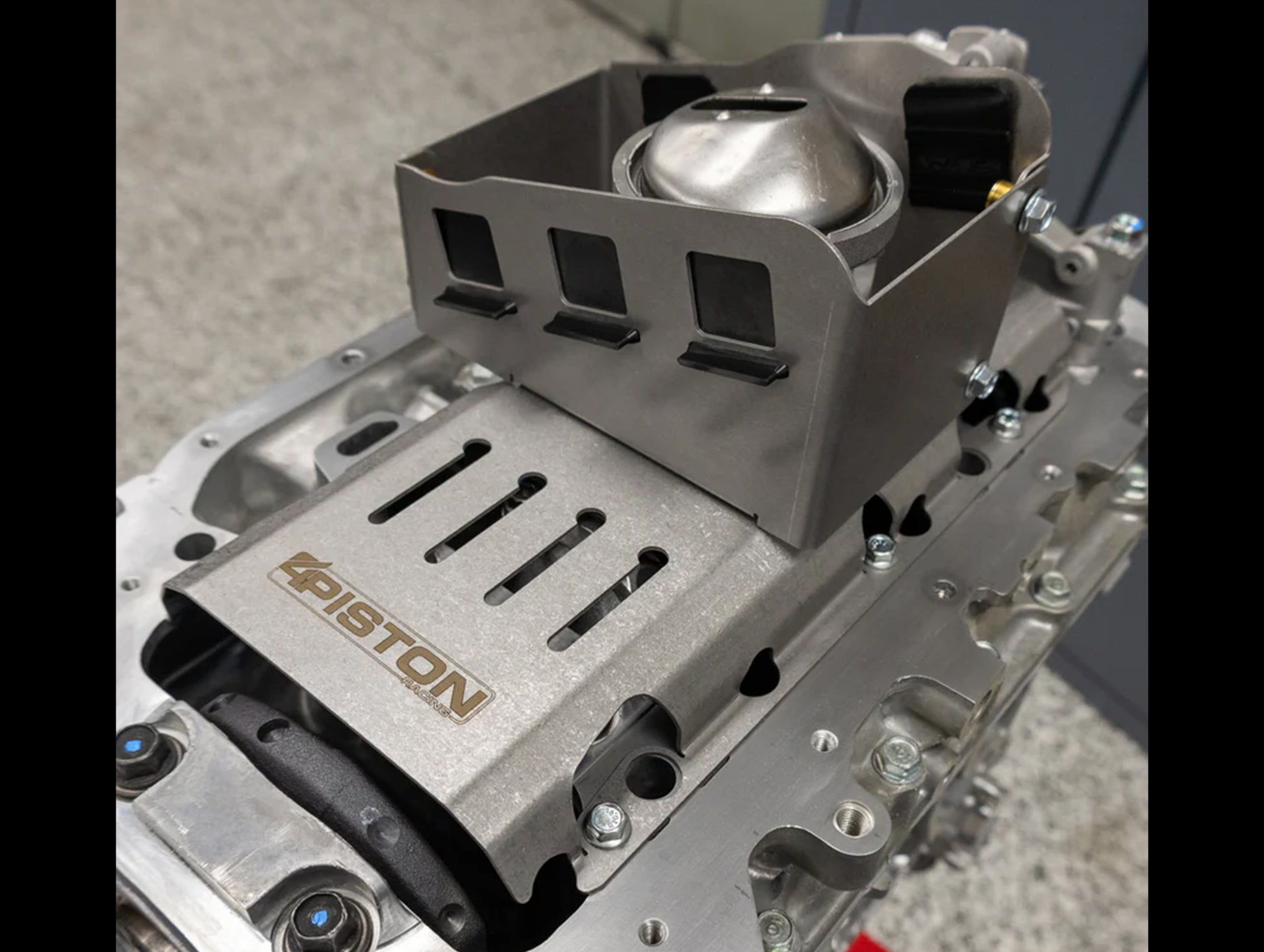 The 4P baffle eliminates this issue and is very easy to install. Other baffles drop in loose or require welding, but the 4P Baffle bolts in securely and also serves as a windage tray. This design does not require you to remove the oil pump to install. Easily install on the ground or on a lift. The 4P oil pan baffle is the ultimate solution for a healthy track day engine.
