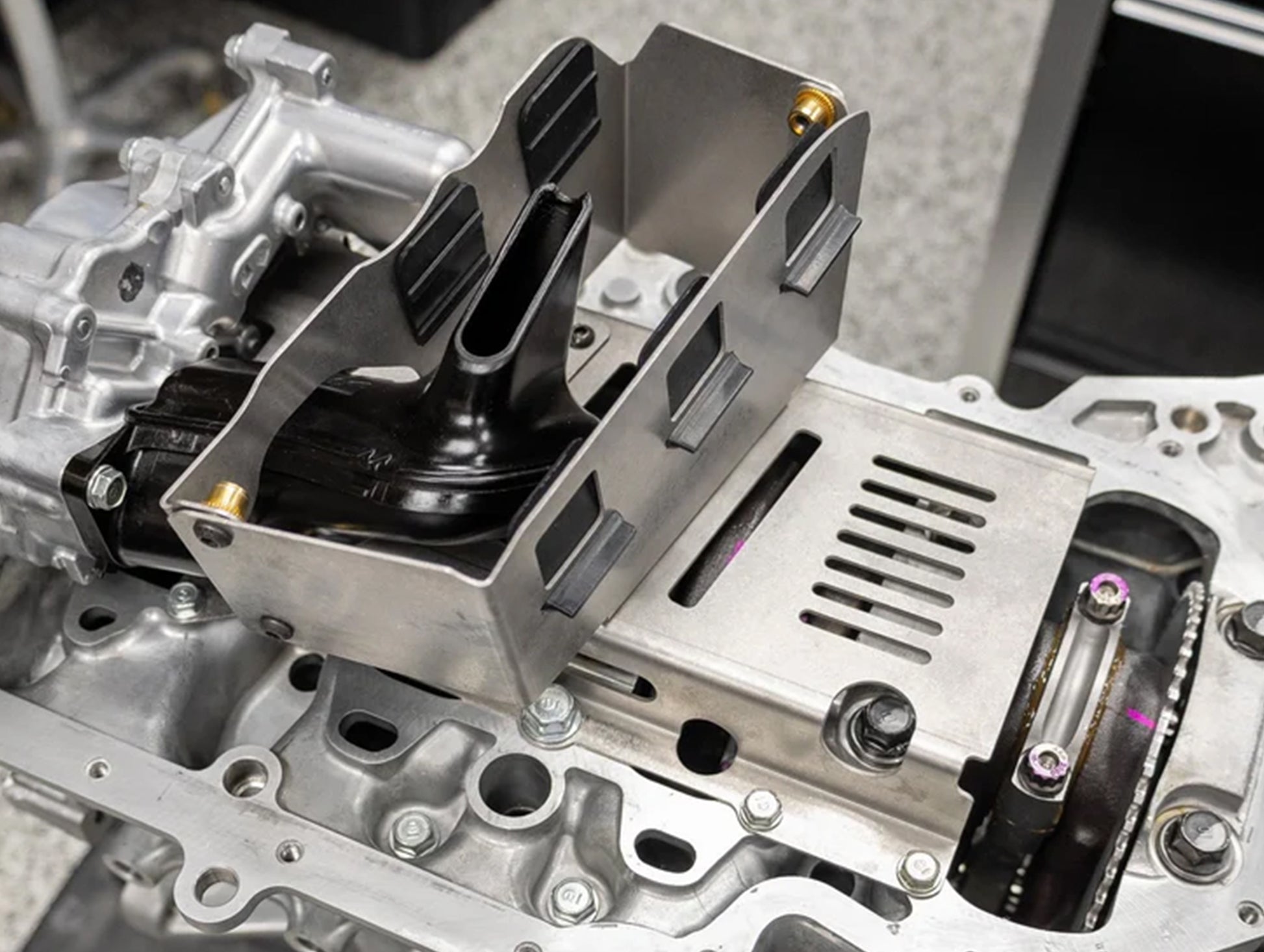 The 4P baffle eliminates this issue and is very easy to install. Other baffles drop in lose or require welding, but the 4P Baffle bolts in securely and also serves as a windage tray. This design does not require you to remove the oil pump to install. Easily install on the ground or on a lift. The 4P oil pan baffle is the ultimate solution for a healthy track day engine.