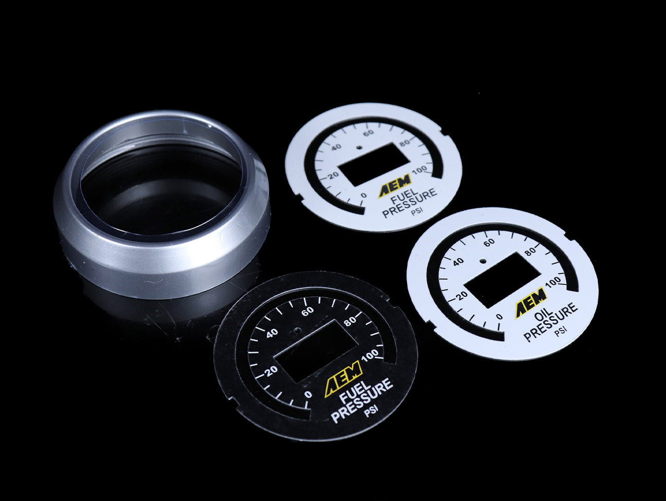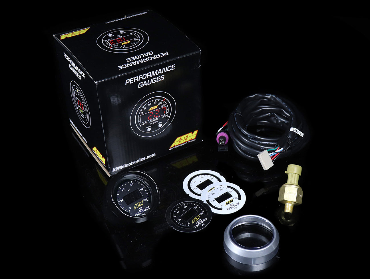 AEM’s digital display gauges feature a standard 52mm gauge housing that fits in most gauge pods and can be remotely mounted virtually anywhere. Each gauge includes interchangeable silver and black bezels and black and white faceplates to personalize the look of your gauge—it’s like having four gauge designs in one!
