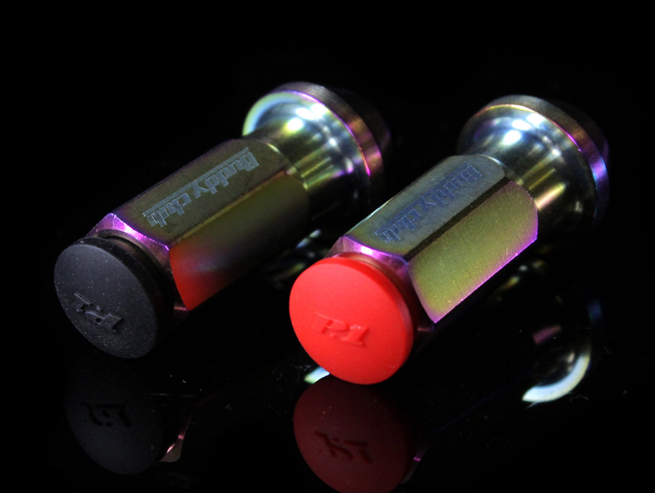 Buddyclub soft plastic lug nut caps with "P1" logo embossed on the top.