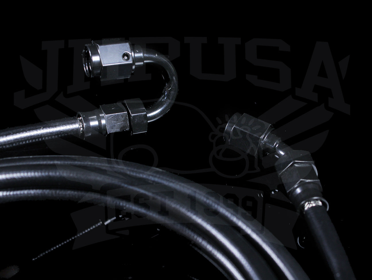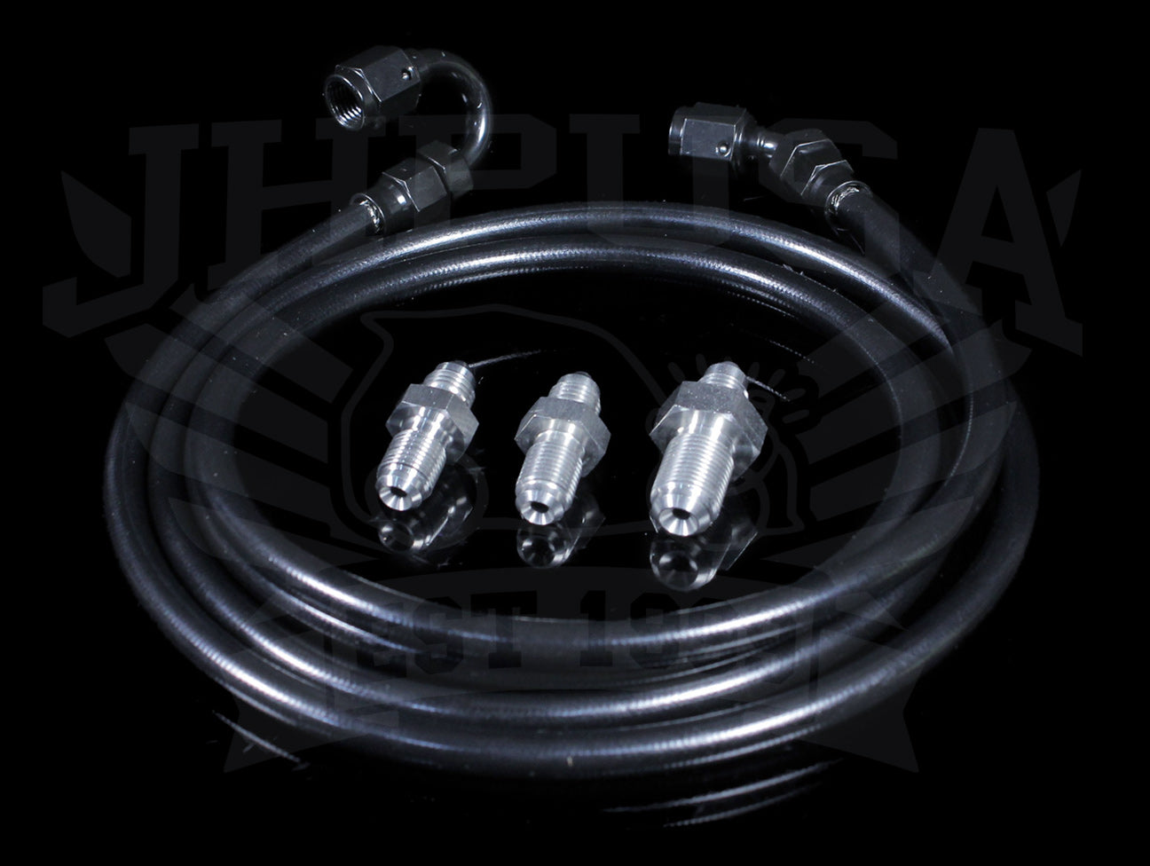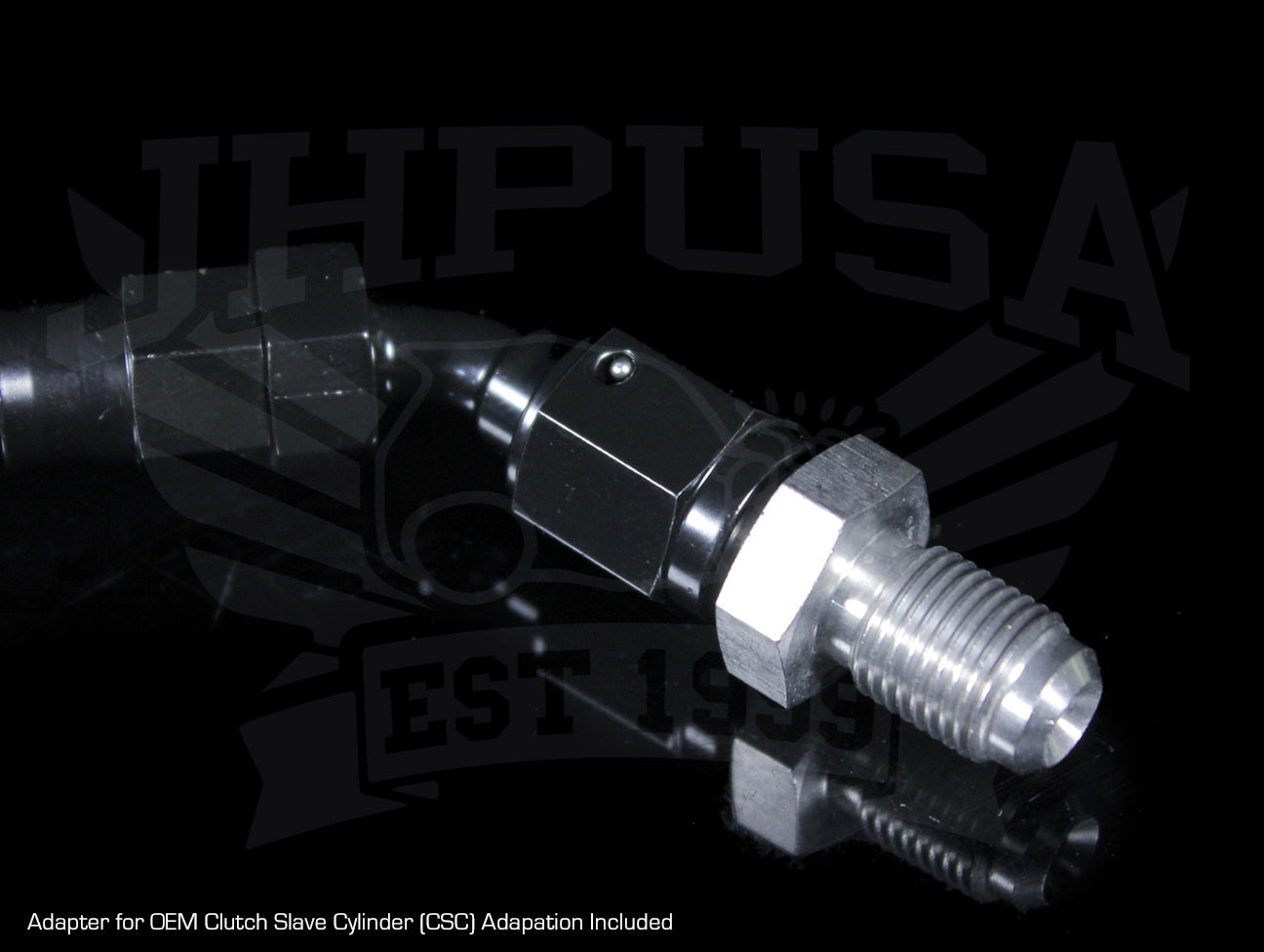 Designed to fit B-series and D-series engine & hydraulic transmission equipped cars perfectly, this fully stainless steel clutch line with SS fittings comes complete with all the adapters needed for both outlet sizes found on oem Honda clutch master cylinders. This way, no matter what master cylinder you have, our clutch line will fit. It also has properly angled fittings on both ends of the hose for a very clean looking install. There is a 180 degree fitting on the master cylinder end and a 45 degree fitting on the slave cylinder end.
