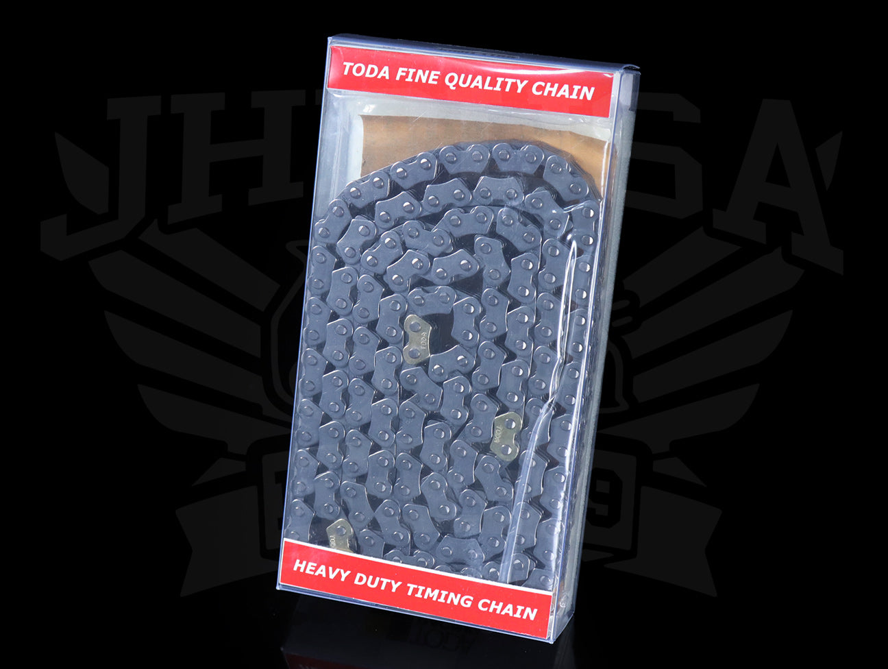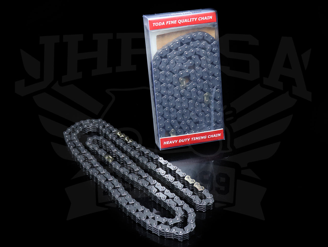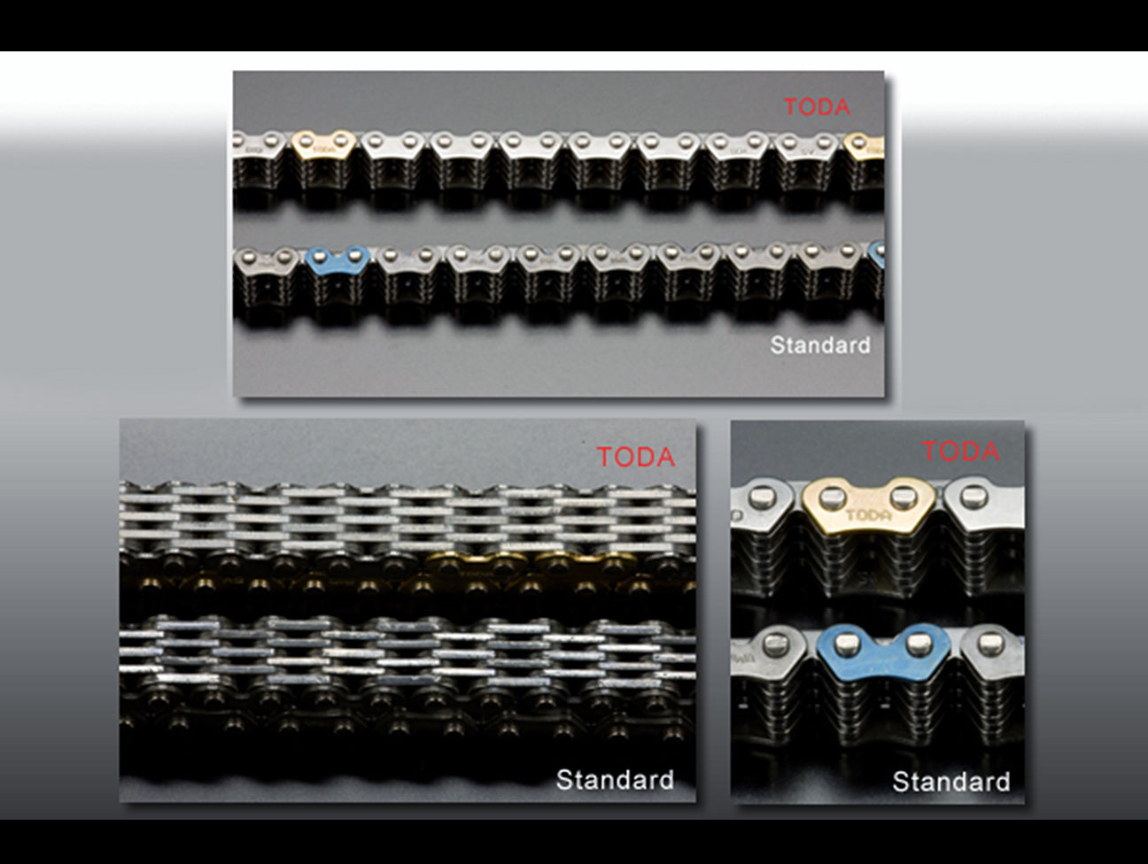 This is TODA Racing's Heavy Duty Timing Chain. With the extra demand of hi-performance driving even with the standard road engine and/or components such as camshafts that place extra stress on the valve train system, improved chain strength is important. The highly precise side plates reduce friction and improve the revolution fatigue strength by increasing the area of the plates, a reduction in the burrs and the finish to each individual plate. Moreover, due to the higher precision of manufacture, the hole size and shape in the plate have enabled the use of a larger diameter pin, this also contributes to reducing the stretching of the chain under constant high velocity revolutions by as much as 35%.
