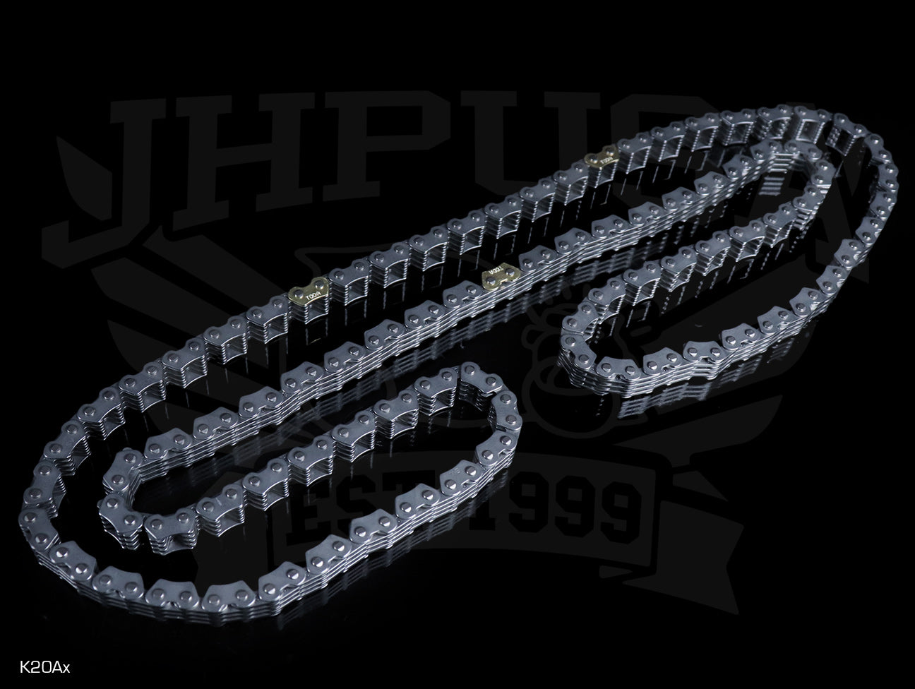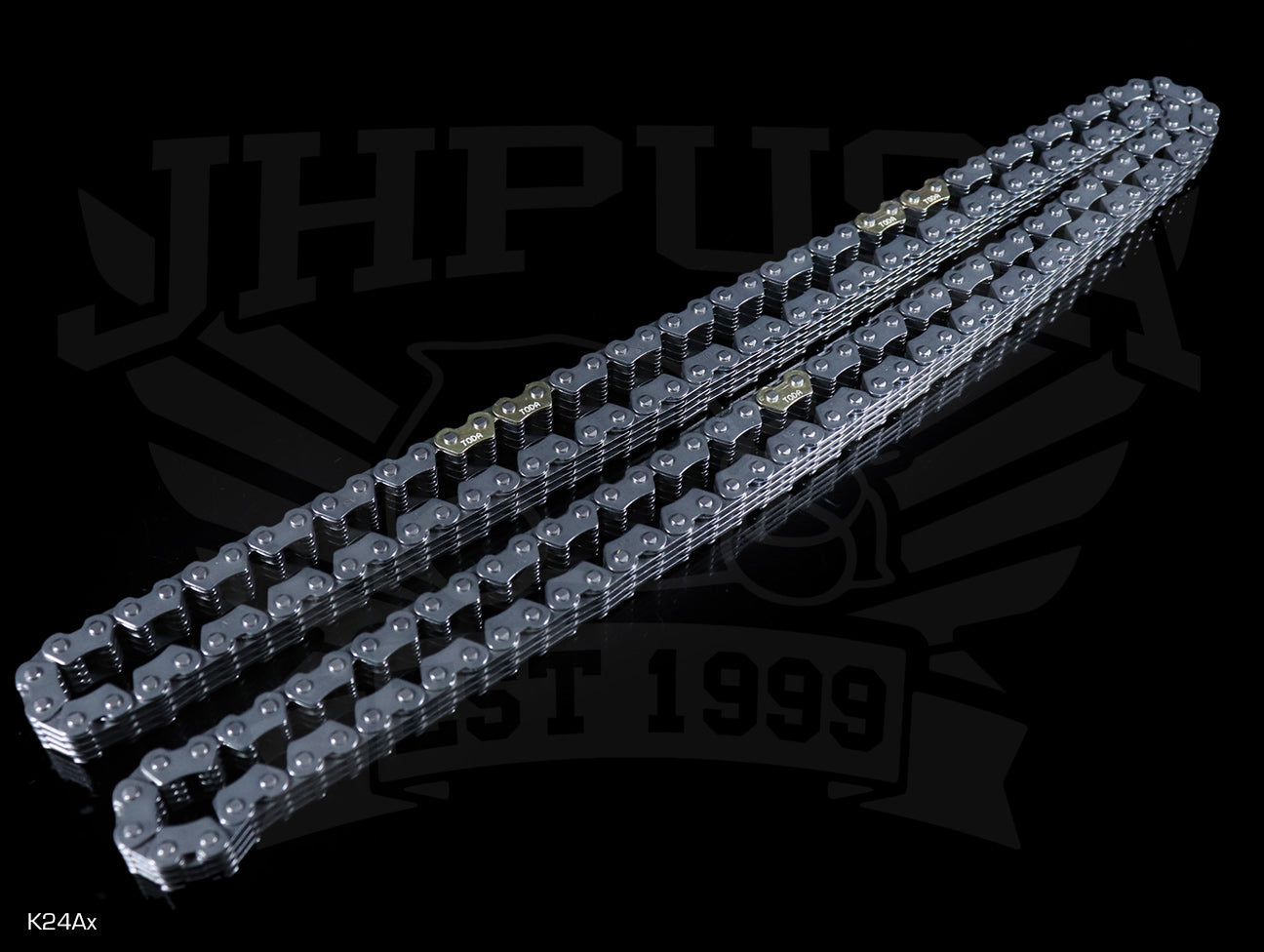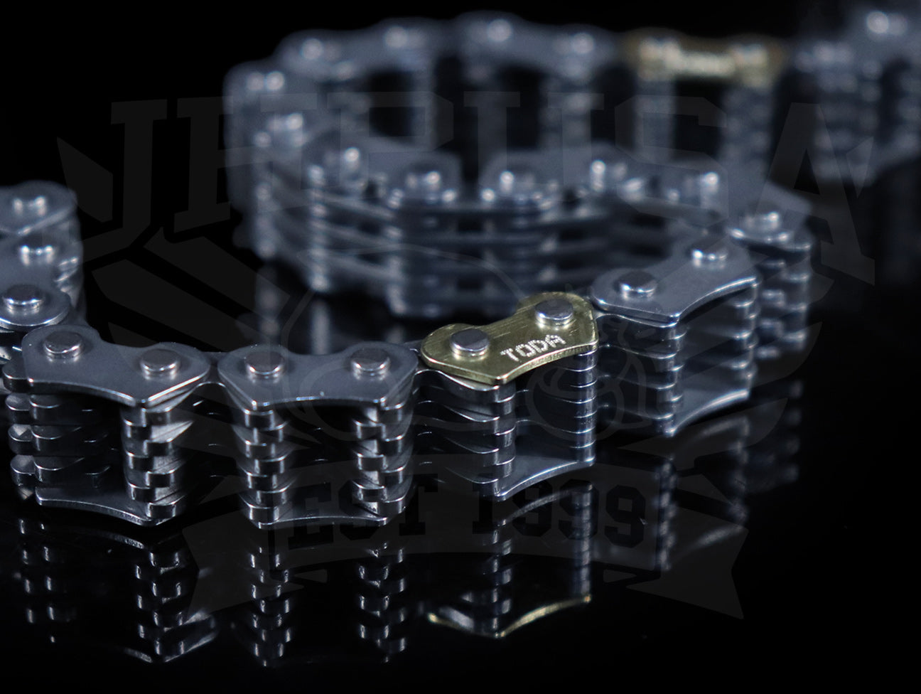 This is TODA Racing's Heavy Duty Timing Chain. With the extra demand of hi-performance driving even with the standard road engine and/or components such as camshafts that place extra stress on the valve train system, improved chain strength is important. The highly precise side plates reduce friction and improve the revolution fatigue strength by increasing the area of the plates, a reduction in the burrs and the finish to each individual plate. Moreover, due to the higher precision of manufacture, the hole size and shape in the plate have enabled the use of a larger diameter pin, this also contributes to reducing the stretching of the chain under constant high velocity revolutions by as much as 35%.